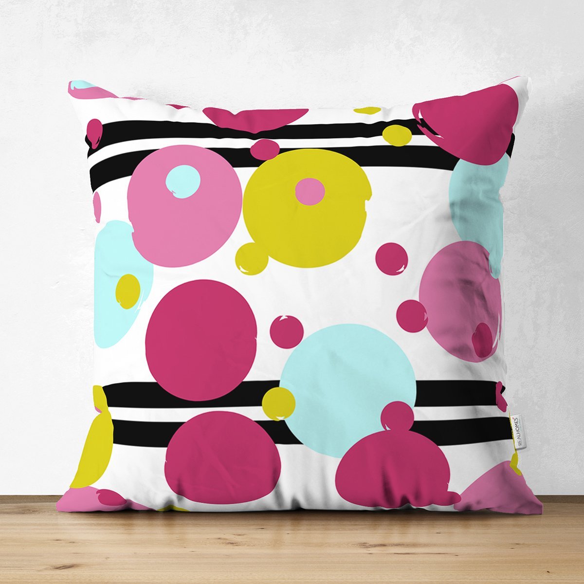 Beyaz Zeminde Siyah Modern Çizgili Renkli Puantiyeli Dijital Baskılı Modern Süet Yastık Kırlent Kılıfı