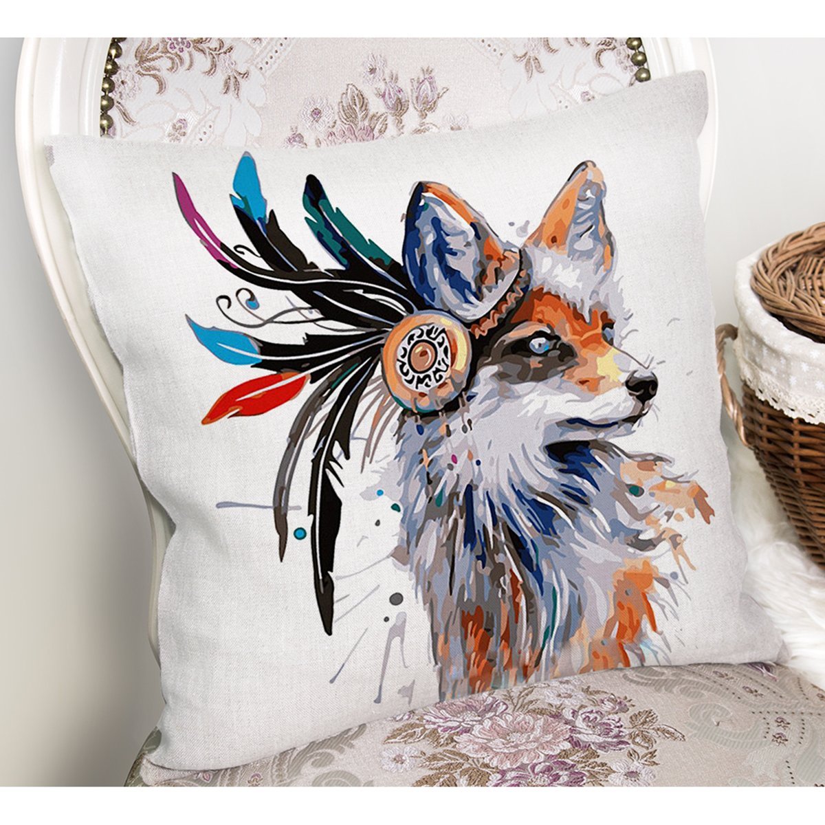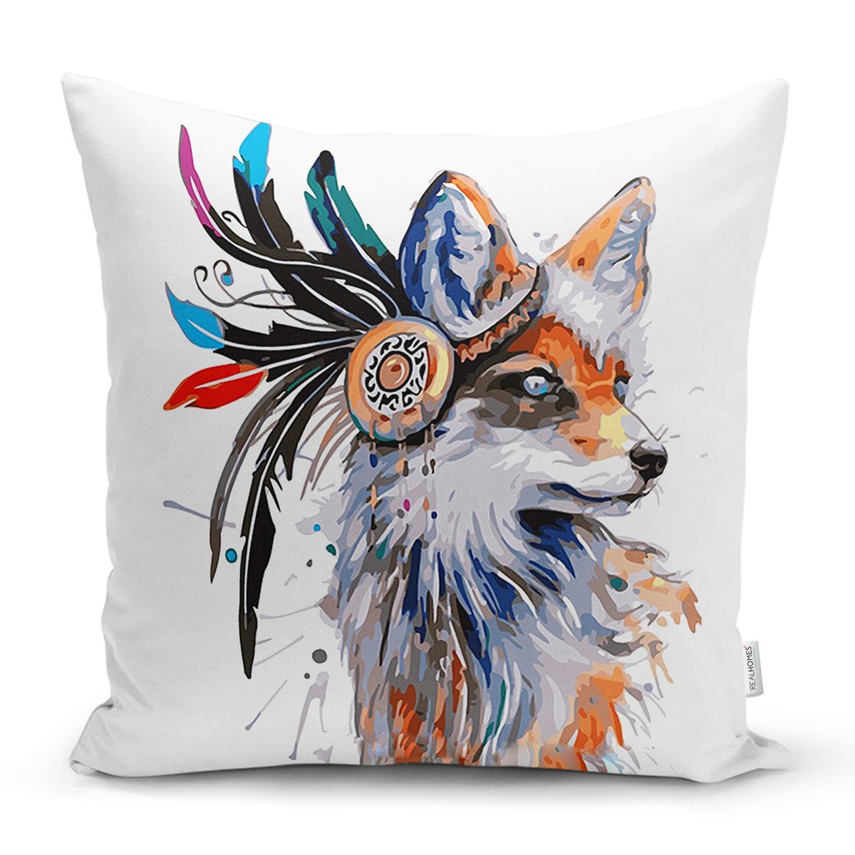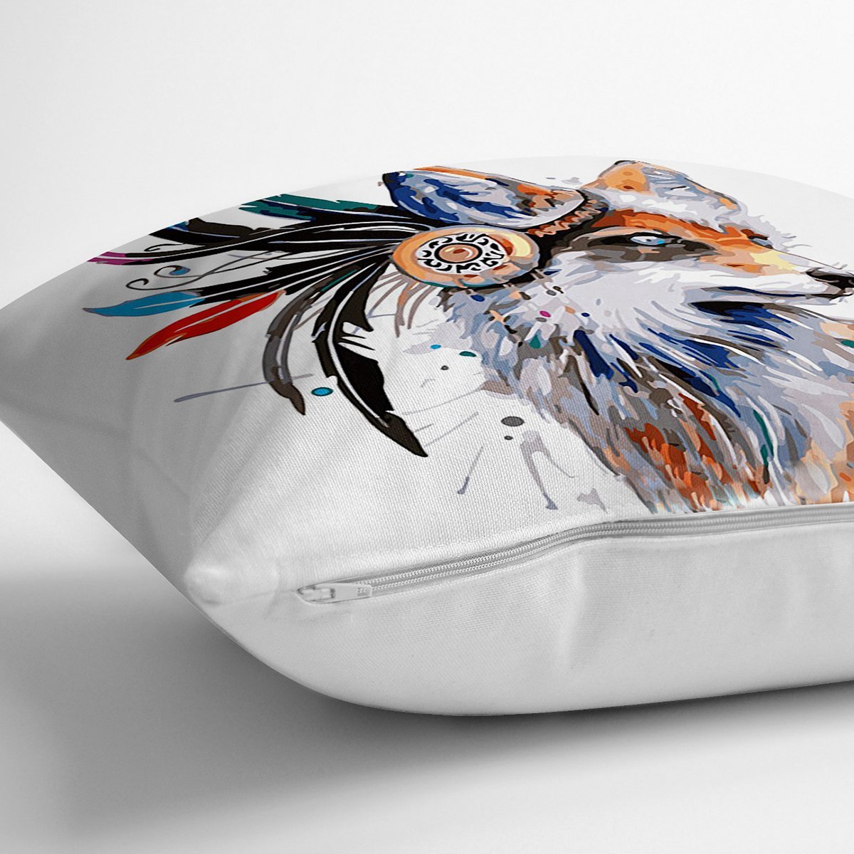 Beyaz Zeminde Suluboya Kurt Desenli Dekoratif Yastık Kırlent Kılıfı