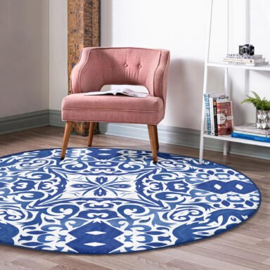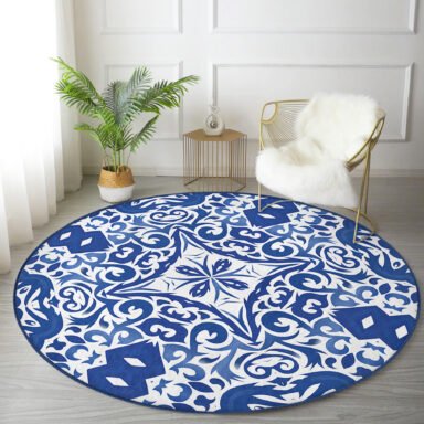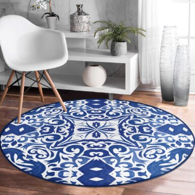 Beyaz Zeminli Çini Desenli Dijital Baskılı Lacivert Mutfak Yıkanabilir Kaymaz Tabanlı Yuvarlak Halı