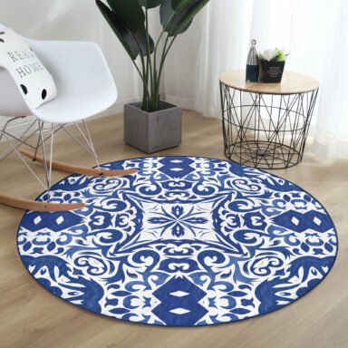 Beyaz Zeminli Çini Desenli Dijital Baskılı Lacivert Mutfak Yıkanabilir Kaymaz Tabanlı Yuvarlak Halı