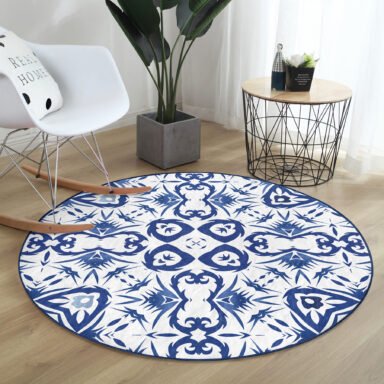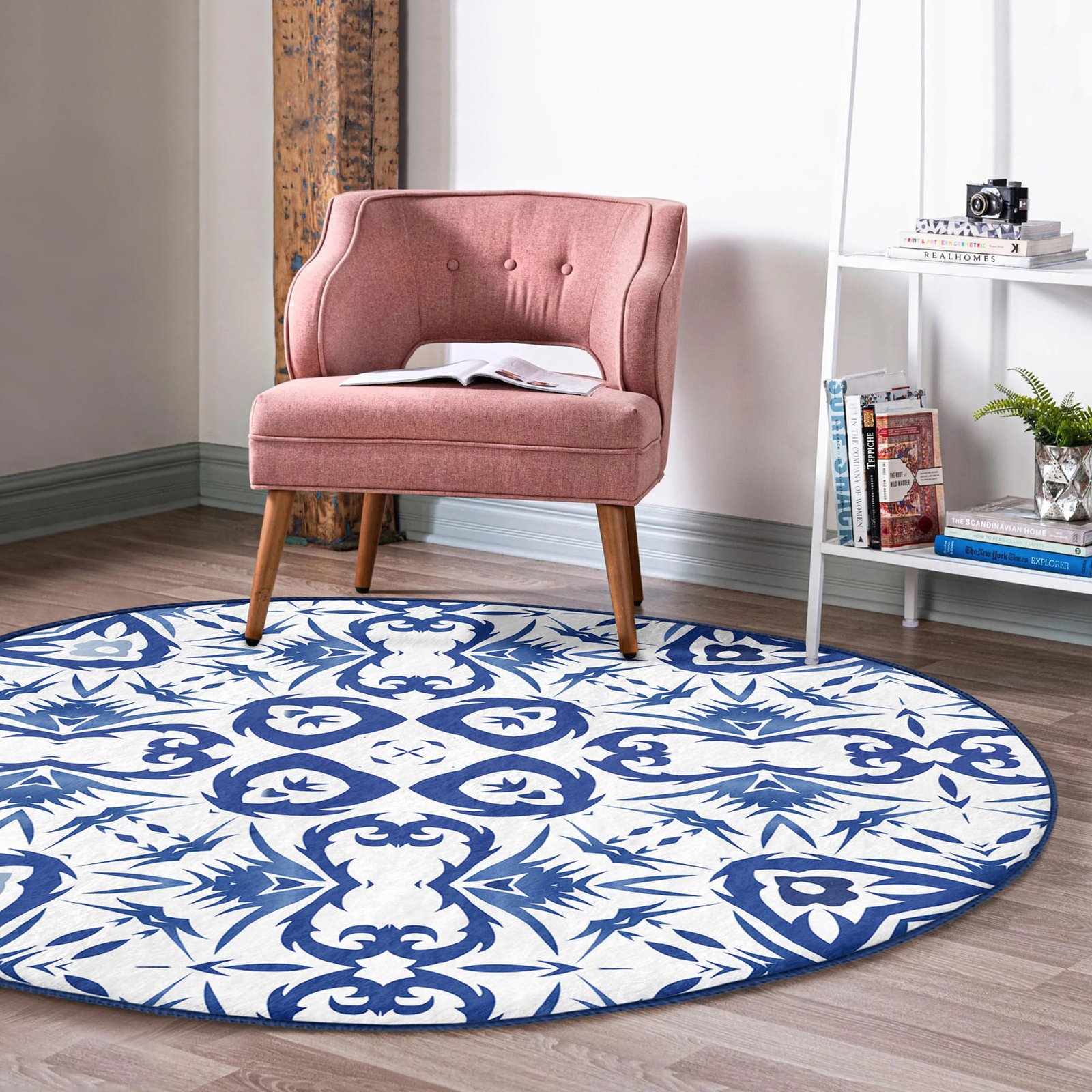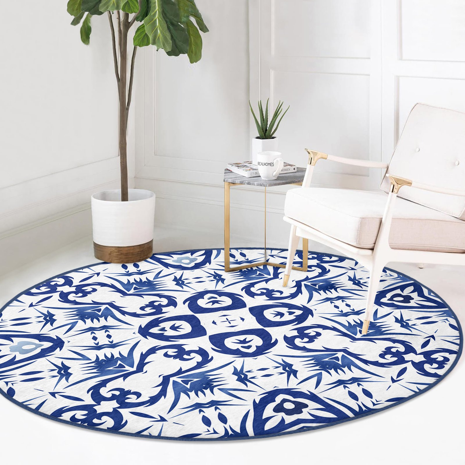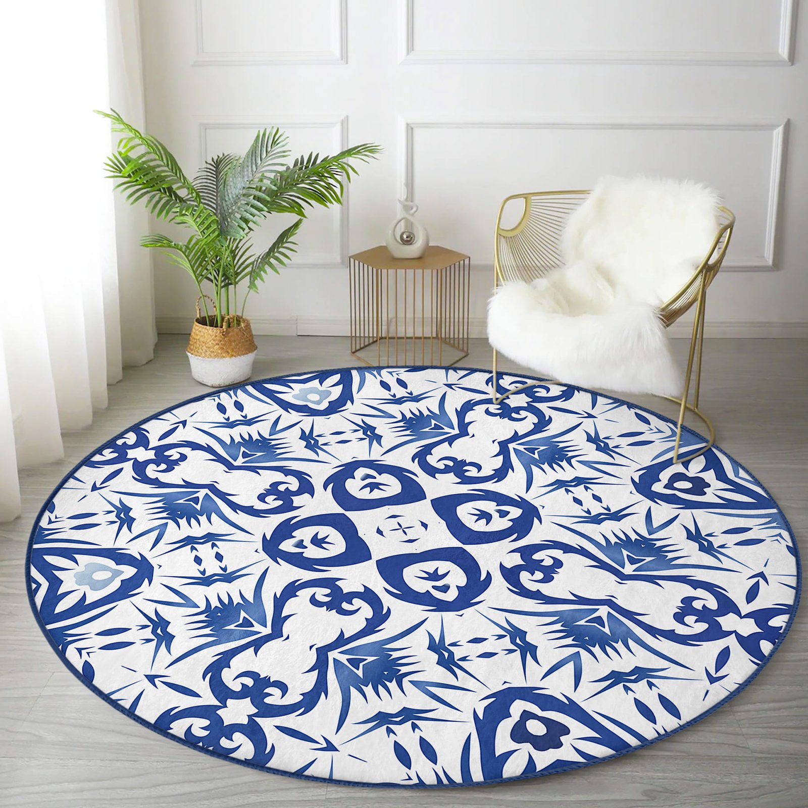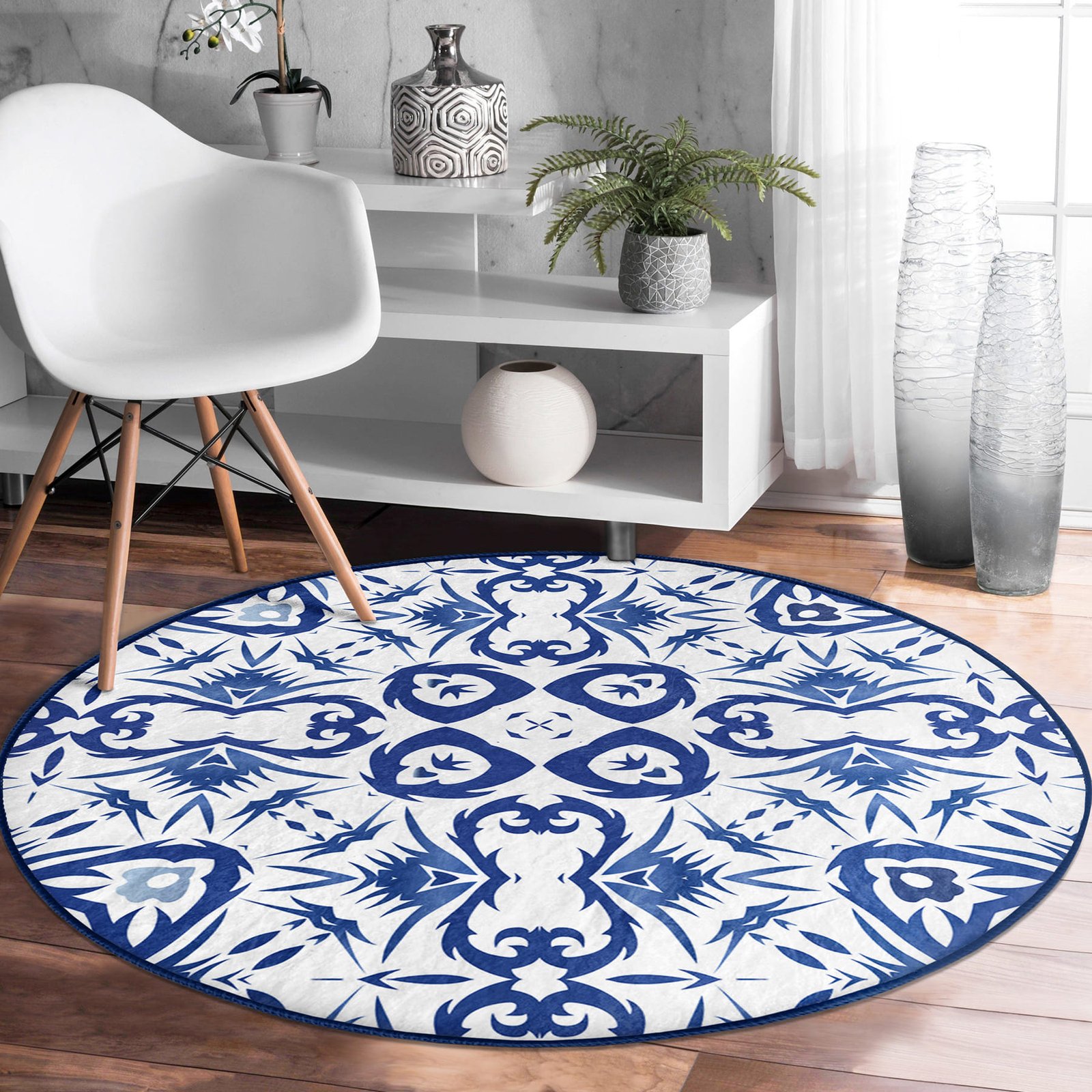 Beyaz Zeminli Çini Desenli Dijital Baskılı Lacivert Mutfak Yıkanabilir Kaymaz Tabanlı Yuvarlak Halı