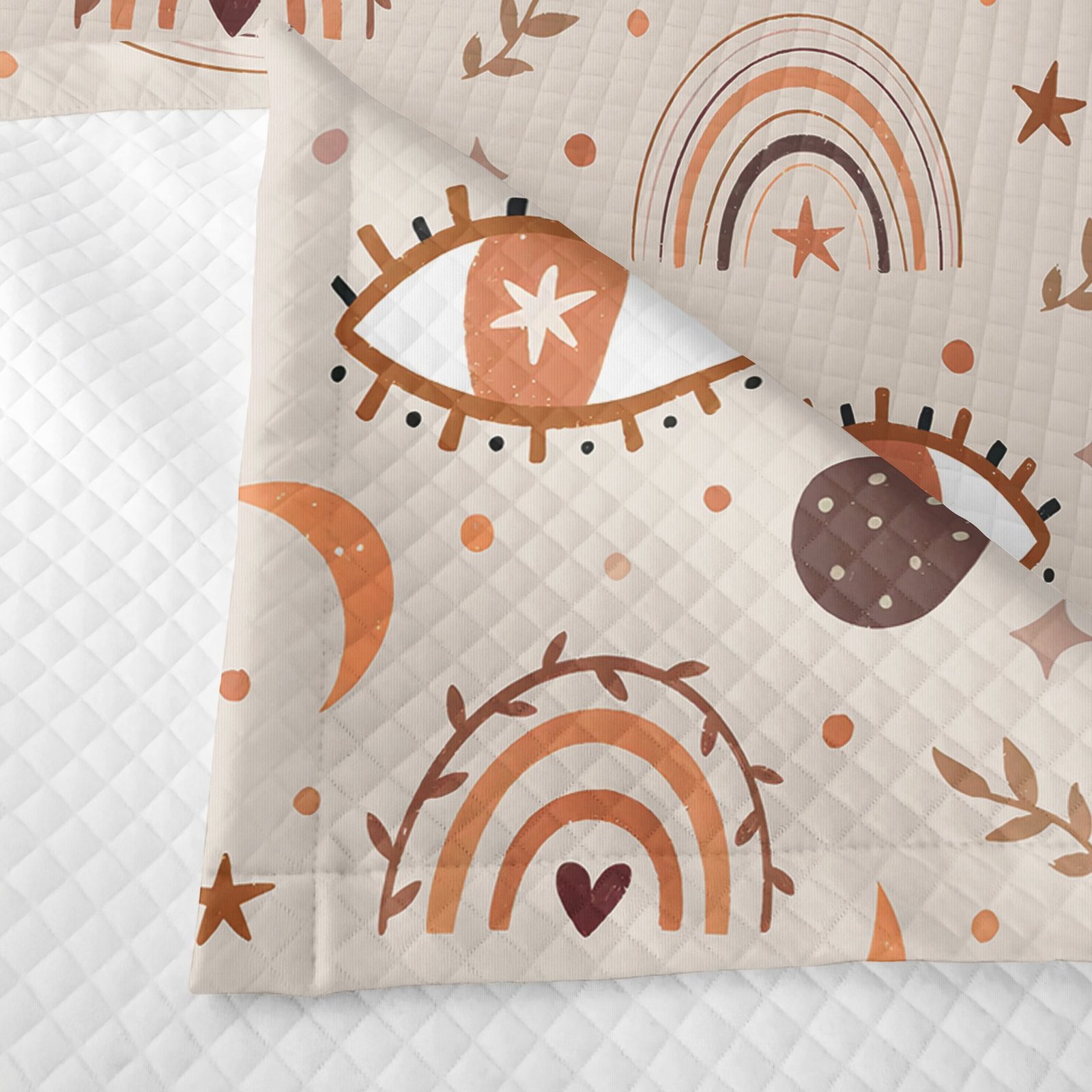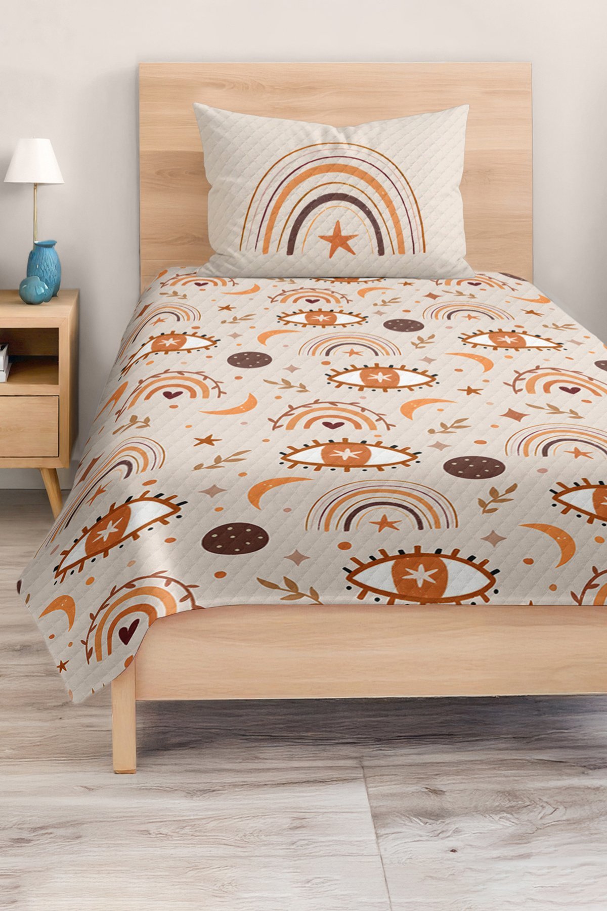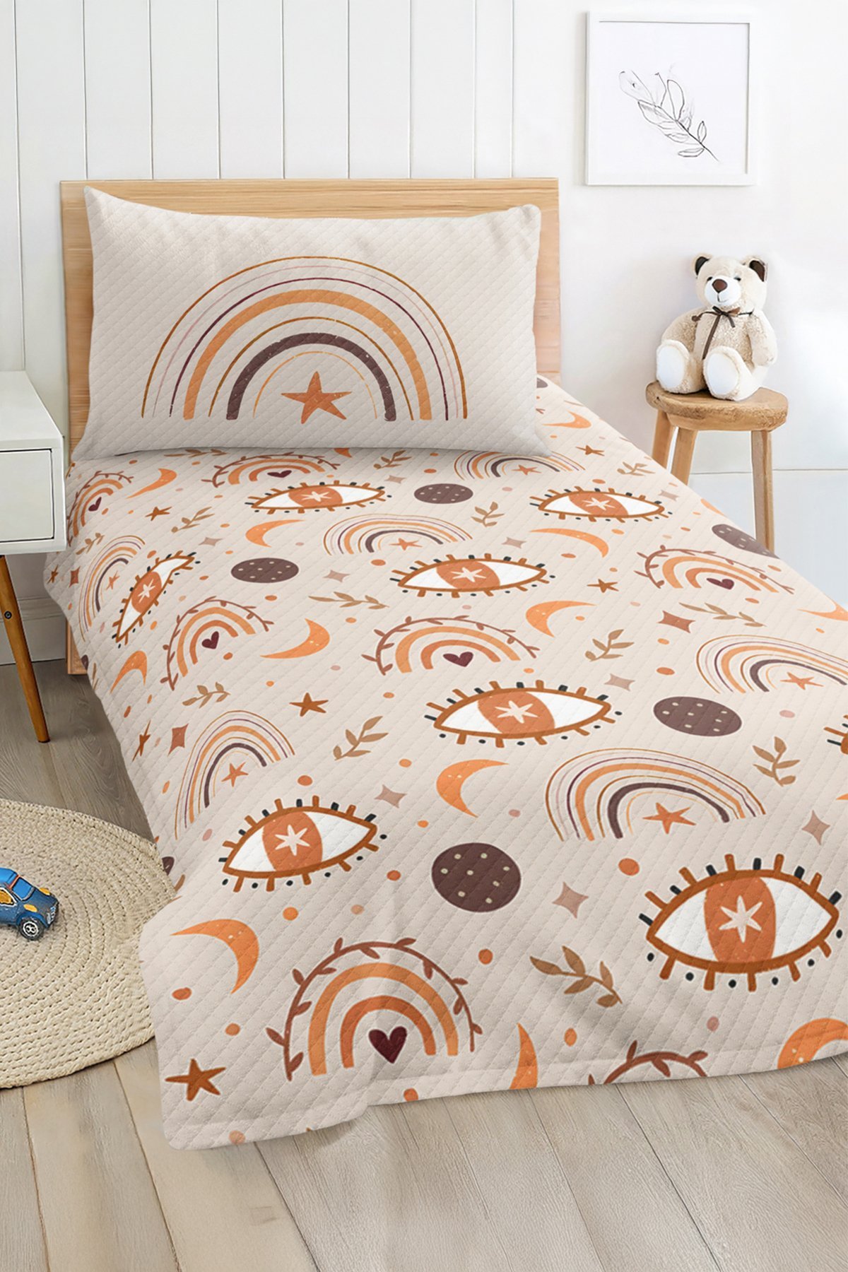 Bohem Tarz Kahverengi ve Turuncu Gökkuşağı ve Göz Desenli Tek Kişilik Çocuk ve Genç Odası Pike Takımı