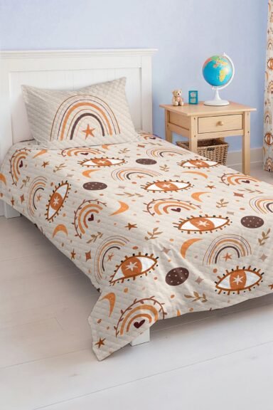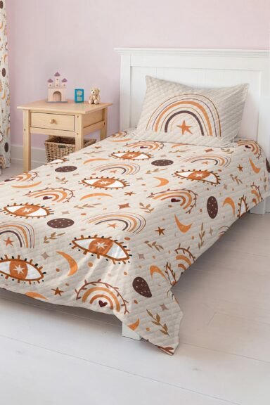 Bu kahverengi ve turuncu gökkuşağı ve göz desenli pike takımı, çocuk ve genç odası için hem şık hem fonksiyonel bir seçimdir. Odaların havasını değiştirirken, konforlu uyku deneyimi sunar.