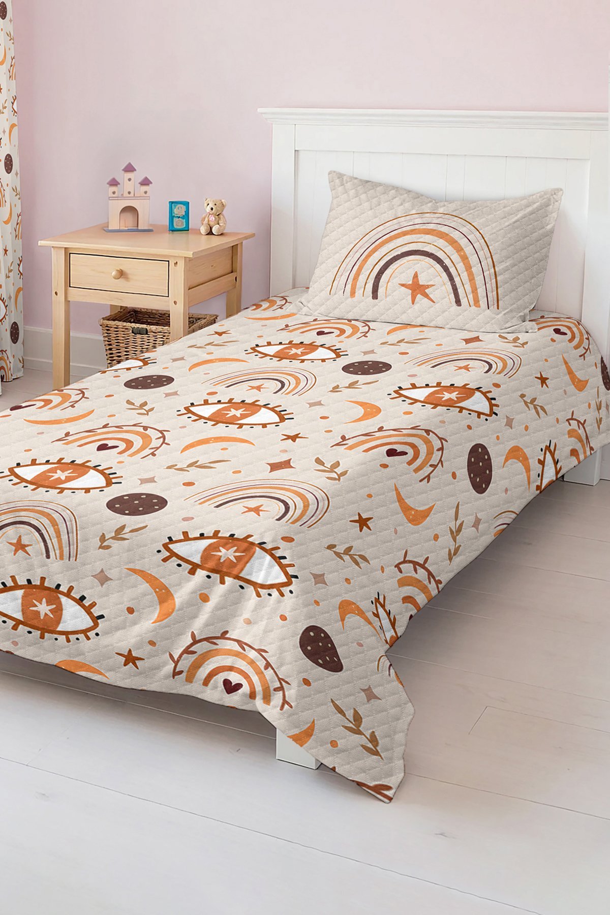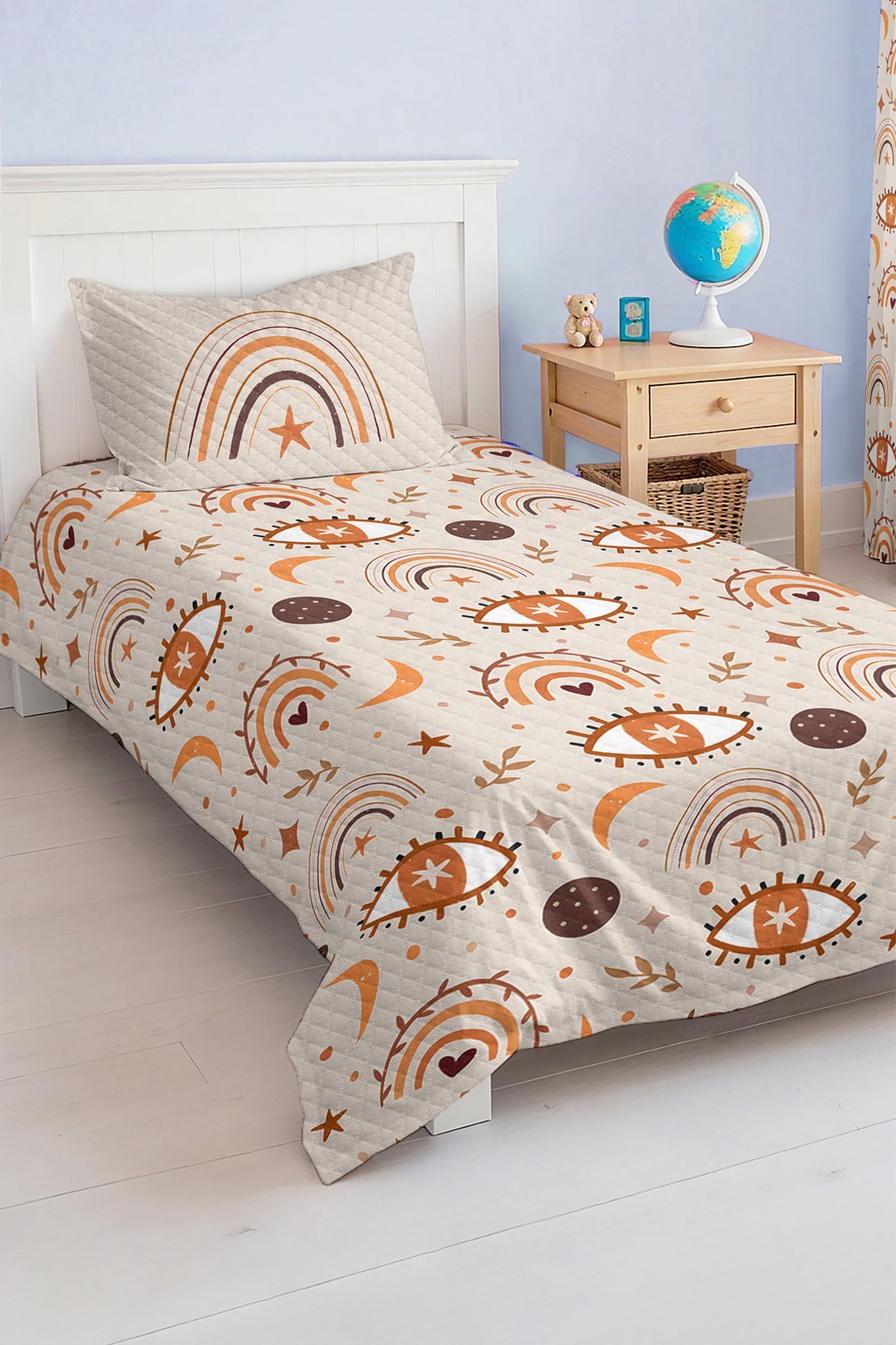 Bohem tarzda kahverengi ve turuncunun farklı tonlarının hakim olduğu gökkuşağı ve göz desenli tek kişilik çocuk pike takımı, genç odası için tasarlanmıştır. Bu çocuk pike takımı görsel olarak dikkat çeken canlı ve sıcak renk kombinasyonları ile odanıza enerjik ve sanatsal bir hava katar. Desen detaylarında, kahverengi ve turuncu renklerle oluşturulmuş gökkuşakları, yıldızlar, ay ve sevgi sembolü olarak kalpler yer almakta olup, büyük göz motifleriyle modern ve özgün bir tarz sunar. Yumuşak pastel tonlardaki bej zemin üstünde yer alan bu desenler hem dekoratif hem de rahatlatıcı bir atmosfer yaratır.