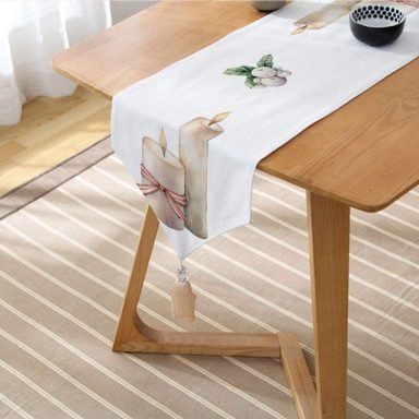Çam Yapraklı Mum Tasarımlı Dijital Baskılı Modern Püsküllü Şönil Üçgen Runner