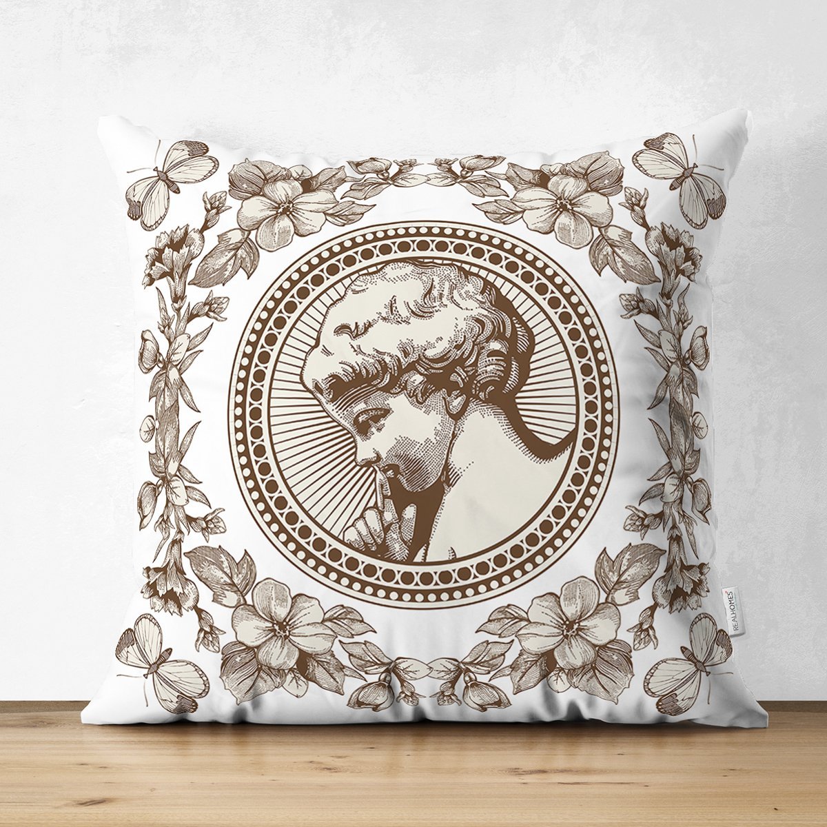 Çiçek Çerçeveli Portre Desenli Dijital Baskılı Dekoratif Süet Yastık Kırlent Kılıfı