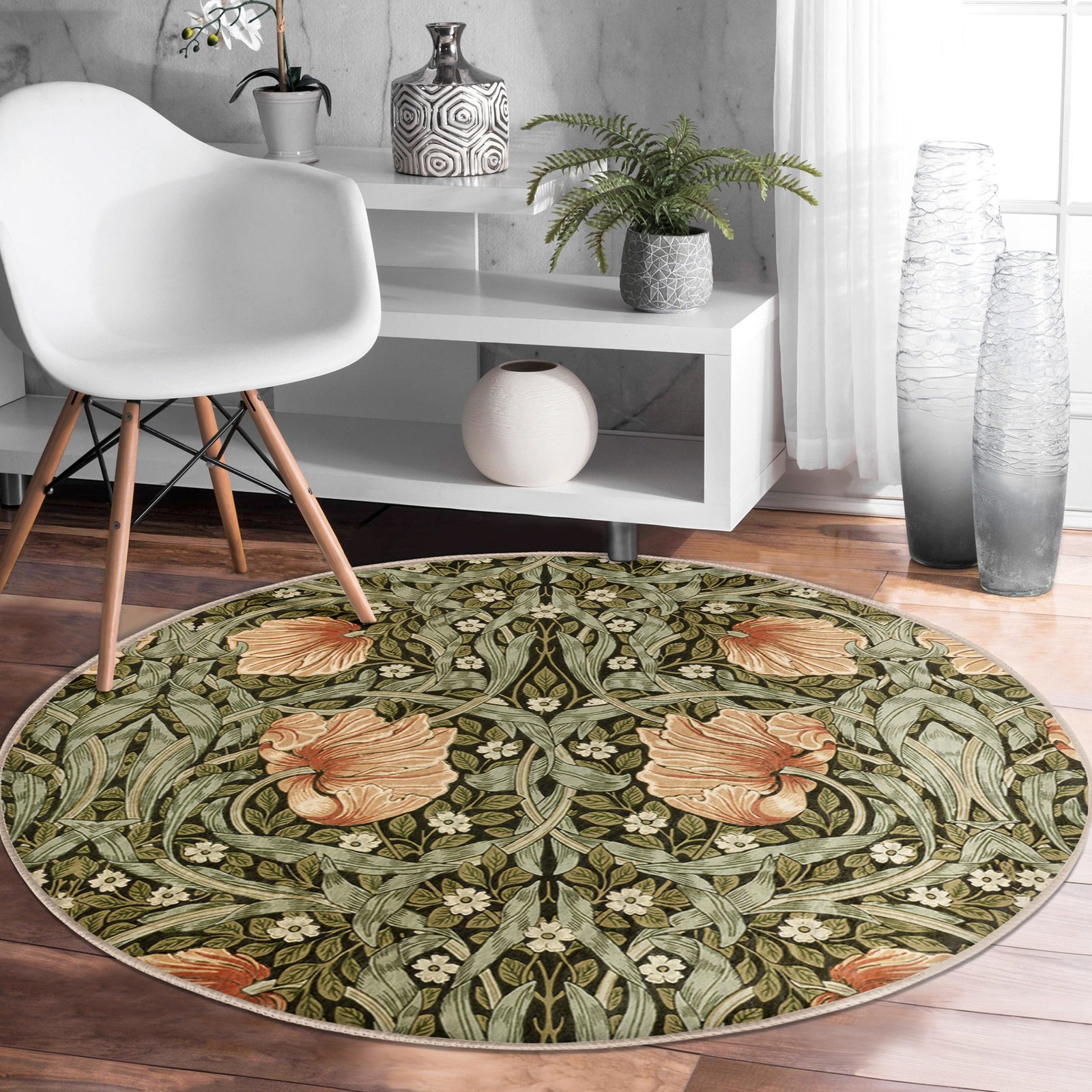 Çiçek Desenli Yeşil ve Krem Renkli Salon İçin Yuvarlak Kaymaz Taban Halı