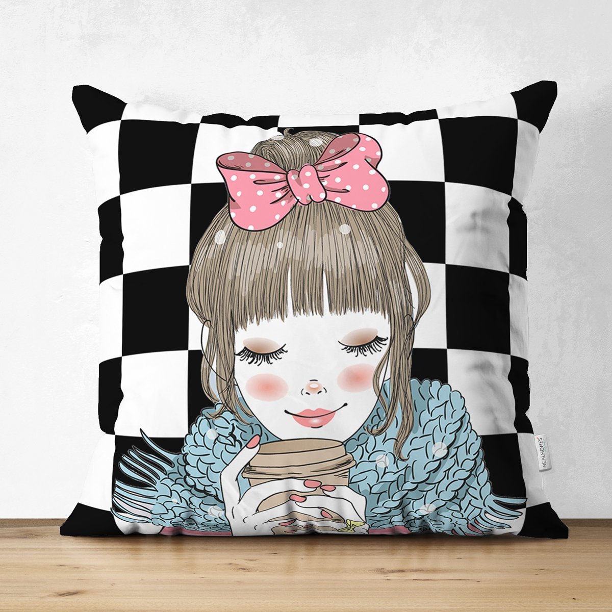 Dama Zeminli Kahve İçen Kız Motifli Dijital Baskılı Dekoratif Süet Yastık Kırlent Kılıfı