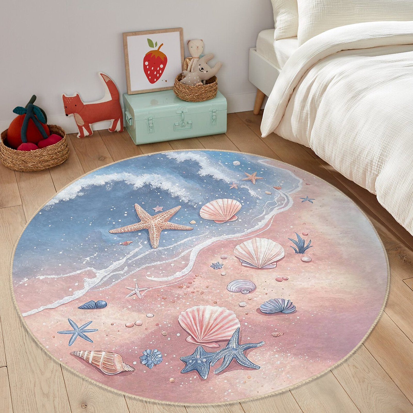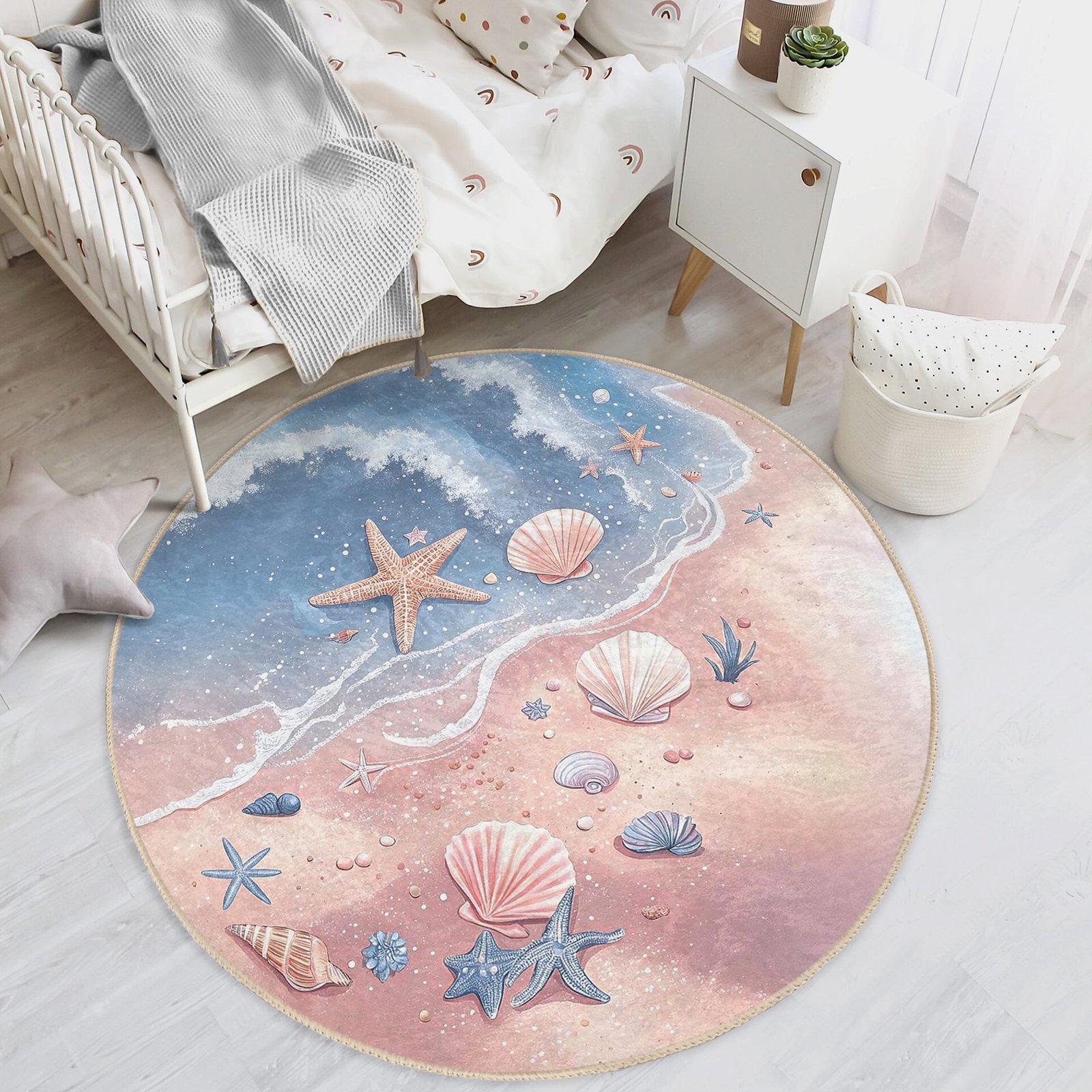 Deniz kabukları ve yıldız balığı desenli sahil temalı yuvarlak çocuk odası halısı, yumuşak pembe kum tonları ile sakin mavi deniz dalgalarını buluşturan tasarımı sayesinde odada masalsı bir deniz atmosferi oluşturur. Pastel mavi, pembe ve bej renklerin uyumu hem kız hem erkek çocuk odalarına uyum sağlarken, deniz yıldızları, kabuklar ve sahil detayları çocuğun hayal gücünü destekler. Yumuşak dokusu ve sıcak renk paleti ile çocuk odasına ferah, huzurlu ve neşeli bir hava katan bu yuvarlak halı, deniz temalı dekoru tamamlayarak oyun alanını konforlu ve davetkar bir köşeye dönüştürür.
