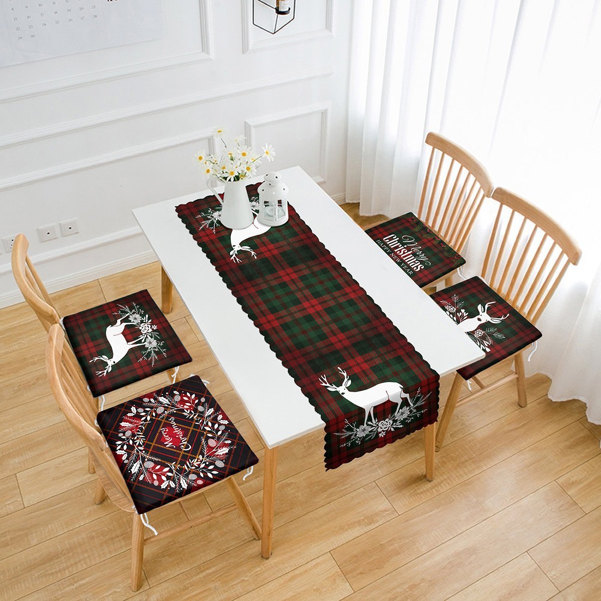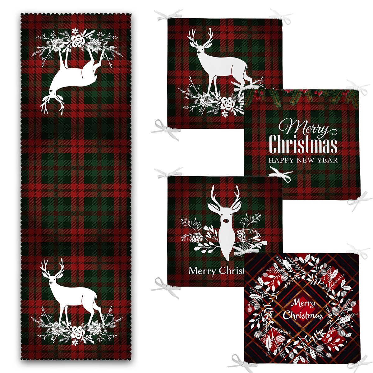 Ekose Zemin Mery Christmas Tasarımlı 4 Fermuarlı Sandalye Minderi ve 1 Runner Seti