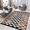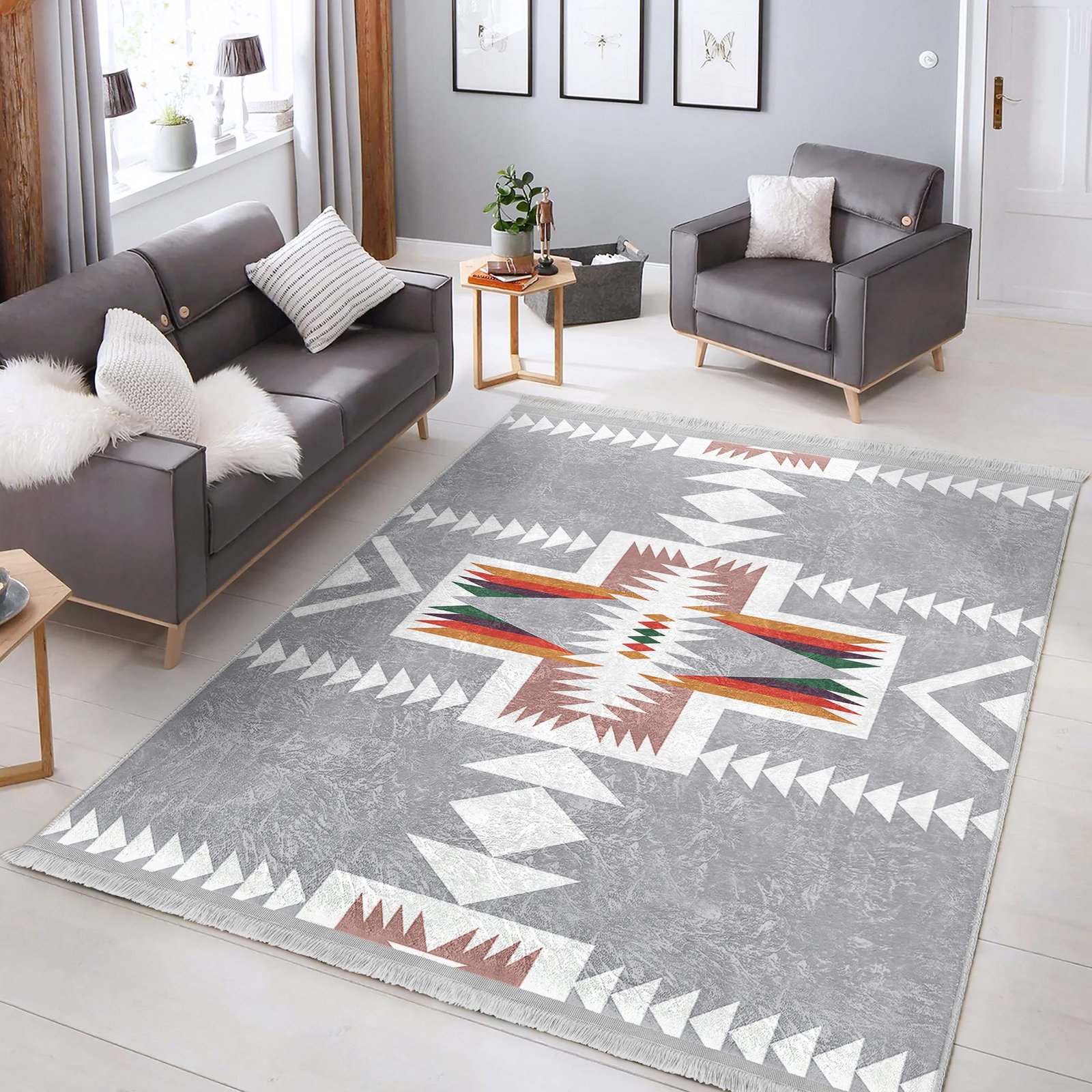 Gri zemin üzerinde simetrik etnik geometrik desenlerin buluştuğu bu modern dikdörtgen halı; ok ve üçgen motifleriyle hareket kazanırken, merkezdeki kilim esintili kompozisyonunda beyaz, kiremit, yeşil ve hardal tonlarıyla sıcak bir denge kurar; çocuk ve bebek odalarında sakin ve düzenli bir atmosfer yaratmaya yardımcı olurken salon, yatak odası ve oturma odasında da dekorasyona modern bir karakter katar; dijital baskı tekniğiyle üretilmiştir, yıkanabilir yapısı pratik kullanım sunar ve kaymaz tabanı sayesinde güvenli bir zemin hissi verir.