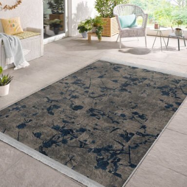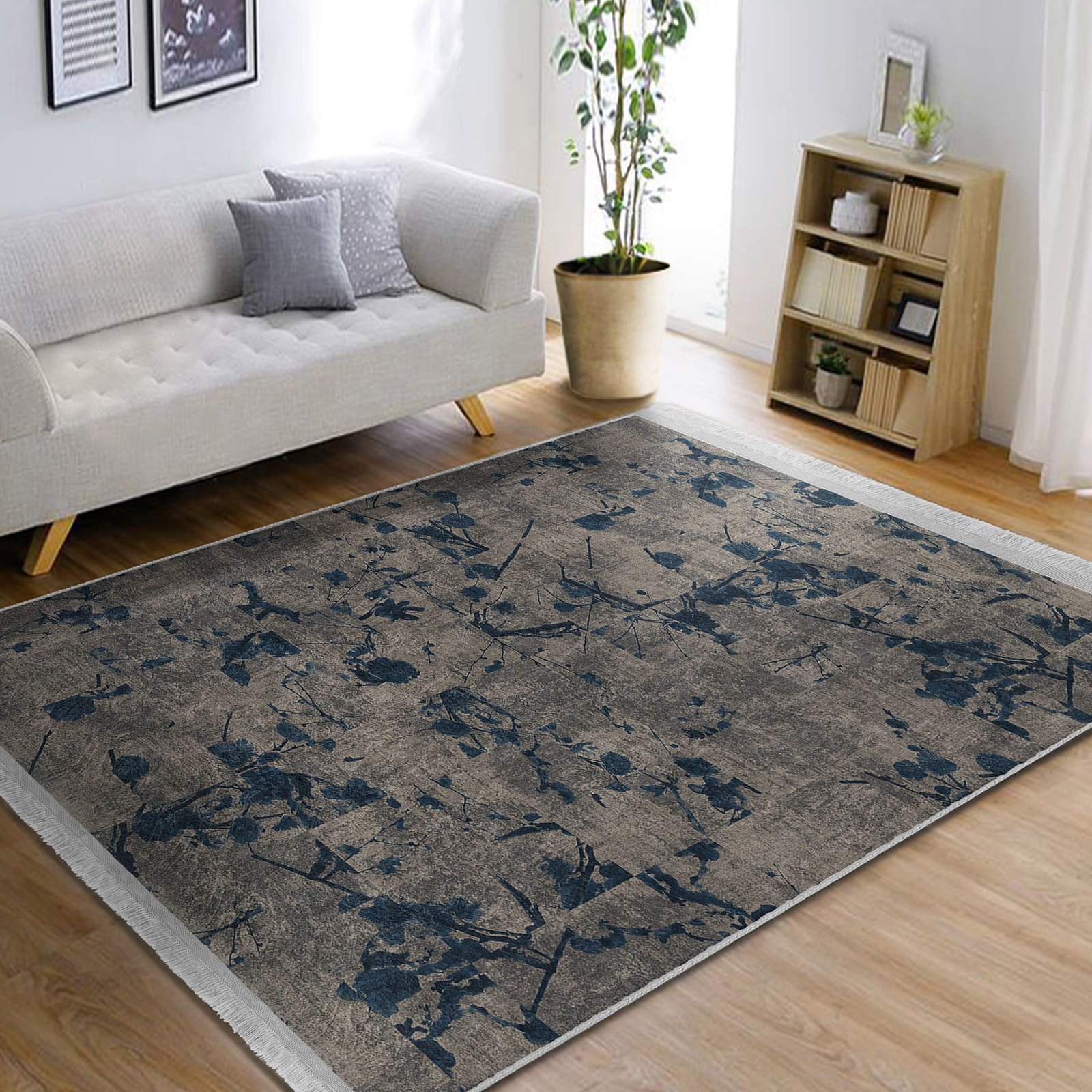 Füme Zeminde Sanat Motifli Lacivert Boya Desenli Eskitme Motifli Modern Koridor & Antre Salon & Oturma Odası Dijital Baskılı Makinede Yıkanabilir Kaymaz Taban Saçaklı Halı
