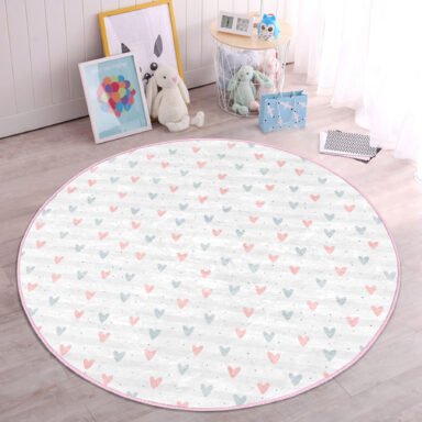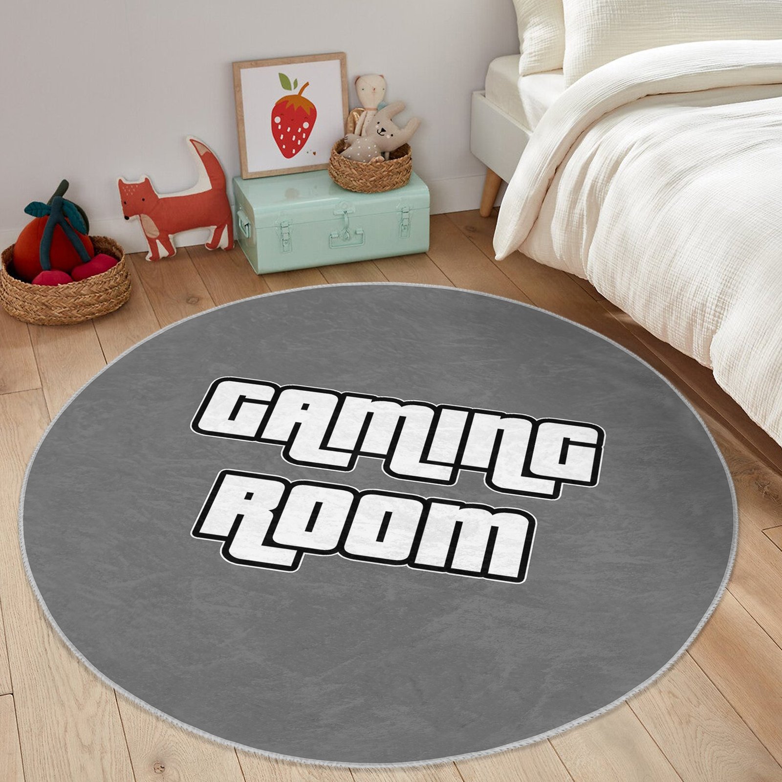 Gaming Room yazılı oyun temalı yuvarlak çocuk odası halısı, gri zemin üzerindeki büyük beyaz tipografik deseniyle modern ve enerjik bir atmosfer oluştururken oyun sever çocukların odasına karakter katar. Sade gri renk, odadaki diğer renkli dekorlarla kolayca uyum sağlarken, dikkat çekici Gaming Room yazısı odada özel bir oyun köşesi hissi yaratır ve çocuğun kendine ait alanını vurgular. Yumuşak dokusuyla konforlu bir oyun zemini sunan bu yuvarlak çocuk odası halısı, hem bilgisayar hem konsol oyunlarını seven çocukların odasını daha eğlenceli, dinamik ve motive edici bir yaşam alanına dönüştürür.