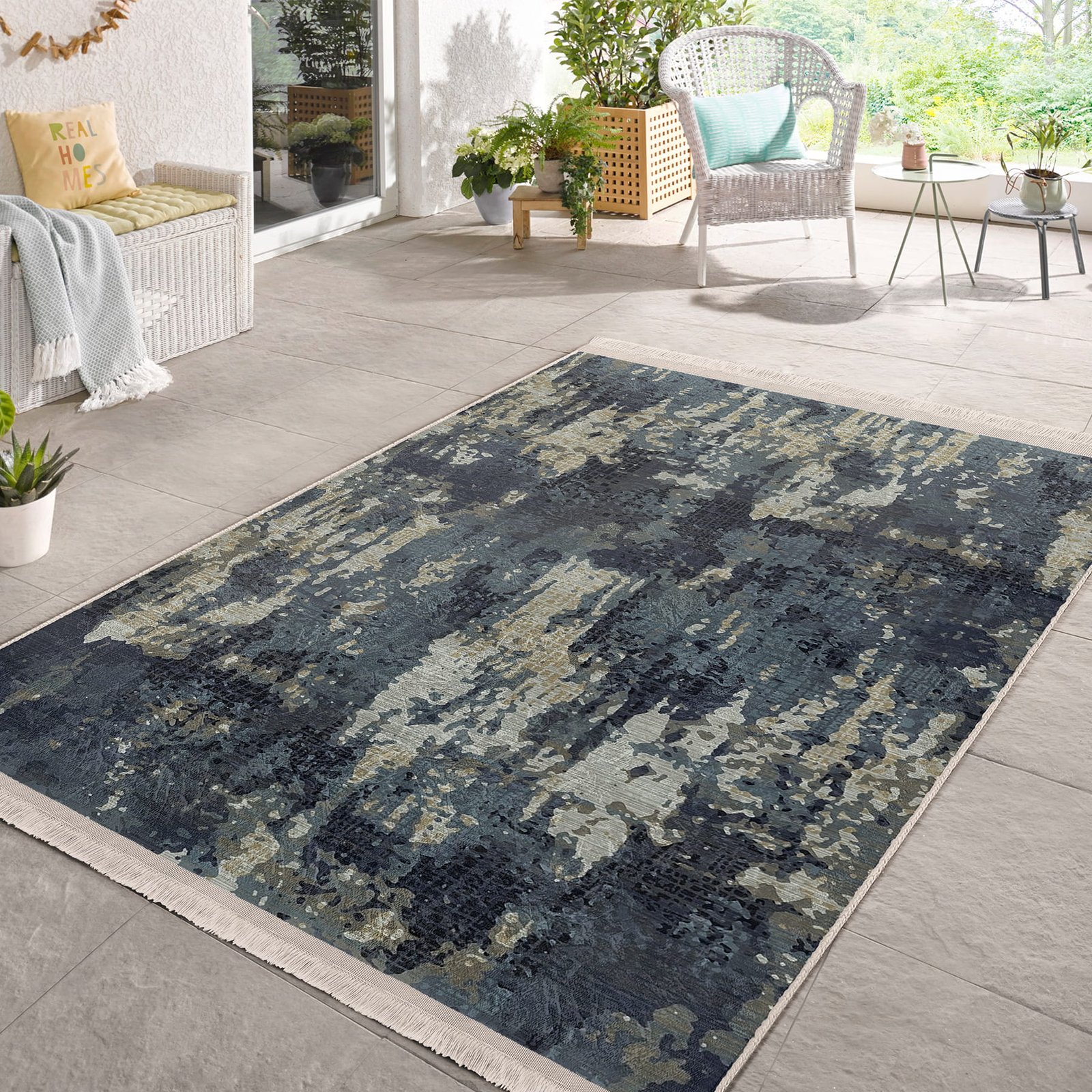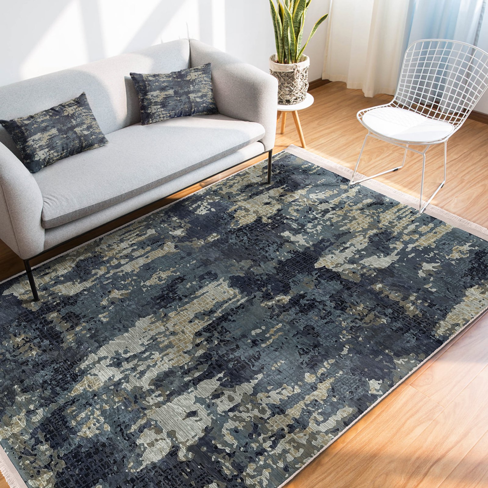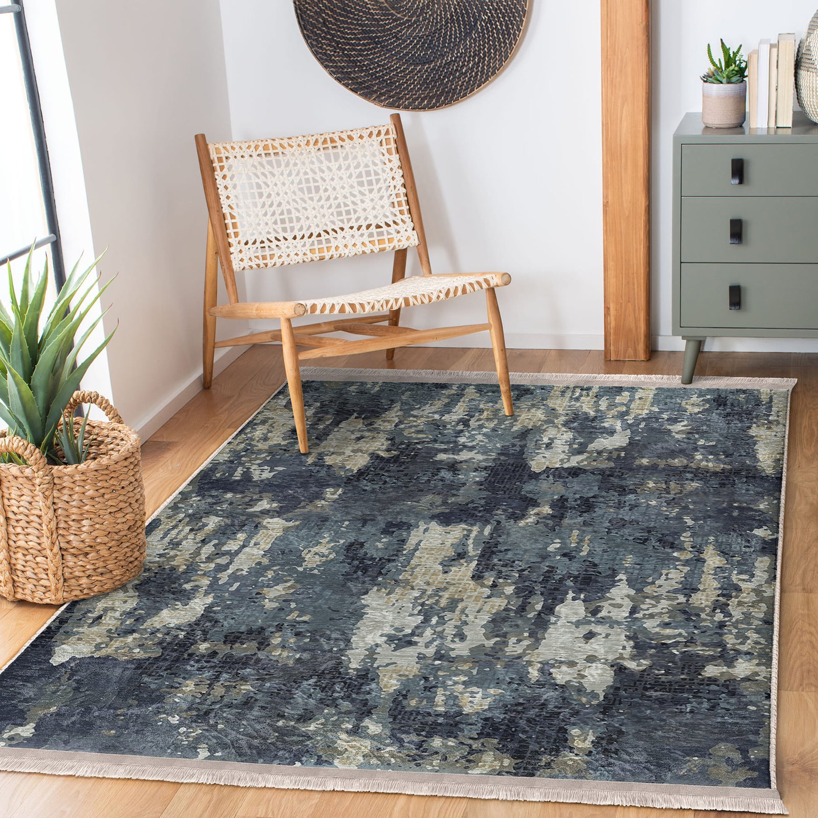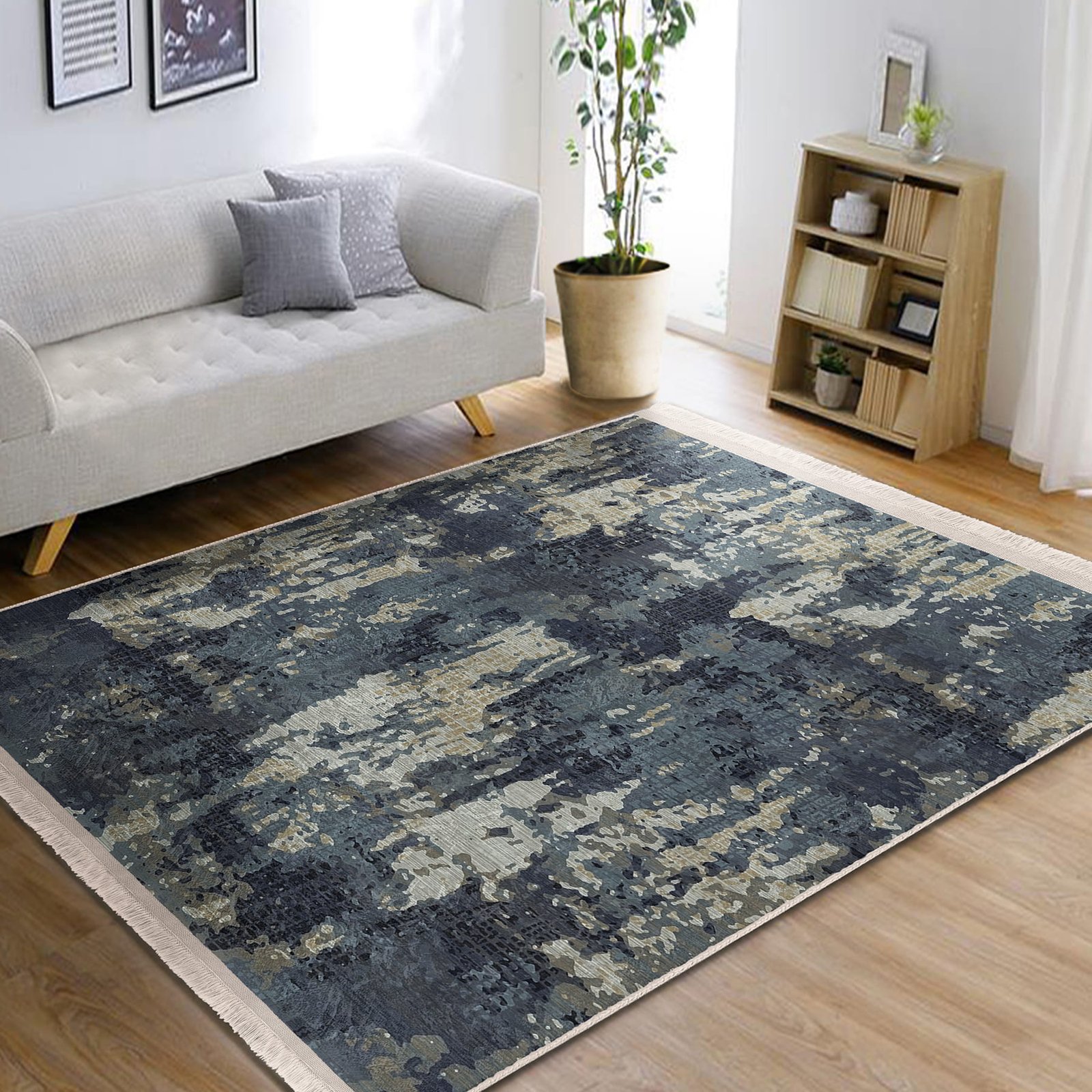 Gri Füme Zeminde Eskitme Motifli Art Sanatsal Desenli Eskitme Motifli Vintage Salon & Oturma Odası Koridor & Antre Dijital Baskılı Makinede Yıkanabilir Kaymaz Taban Saçaklı Halı