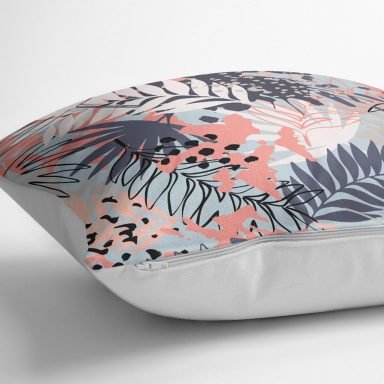 Gri Zemin Üzerimde Pembe Ve Lacivert Baskılı Yaprak Motifli Kırlent Kılıfı