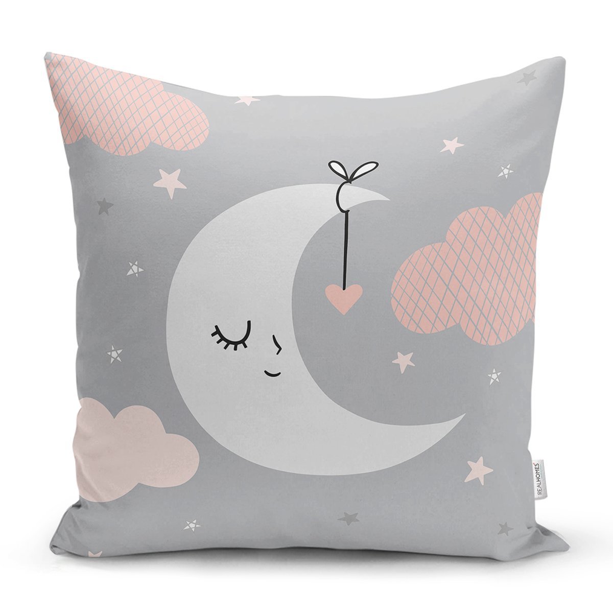 Gri Zeminde Ay ve Bulut Desenli Bebek Odası Yastık Kırlent Kılıfı