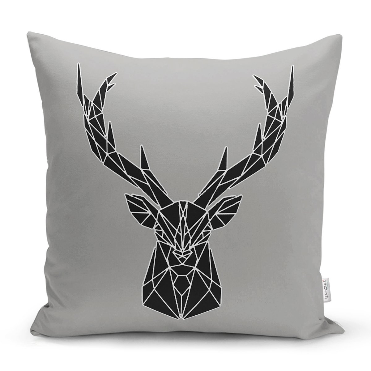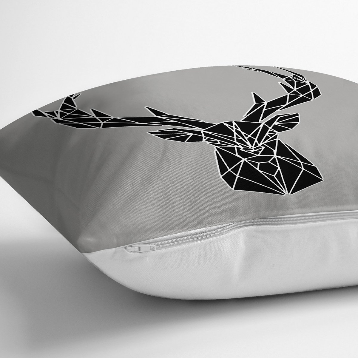 Gri Zeminde Geometrik Geyik Çizimli Modern Yastık Kırlent Kılıfı
