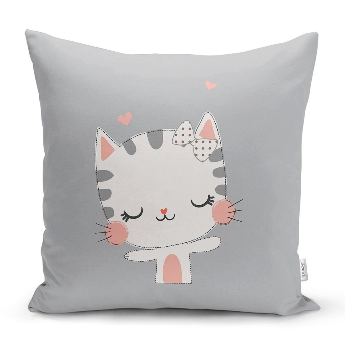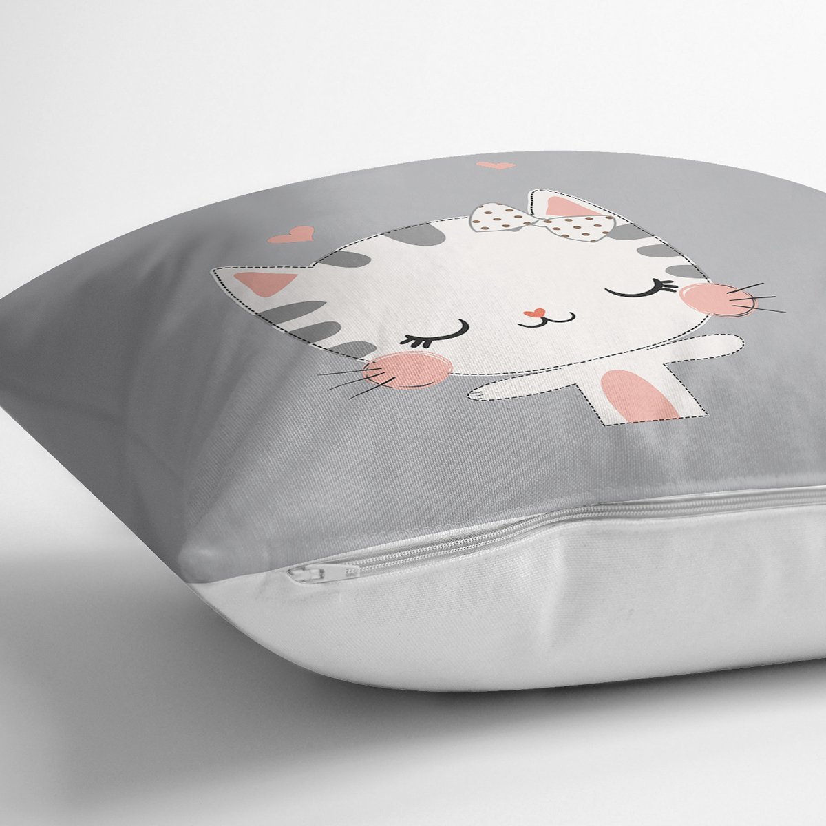 Gri Zeminde Sevimli Kedicik Desenli Modern Yastık Kırlent Kılıfı