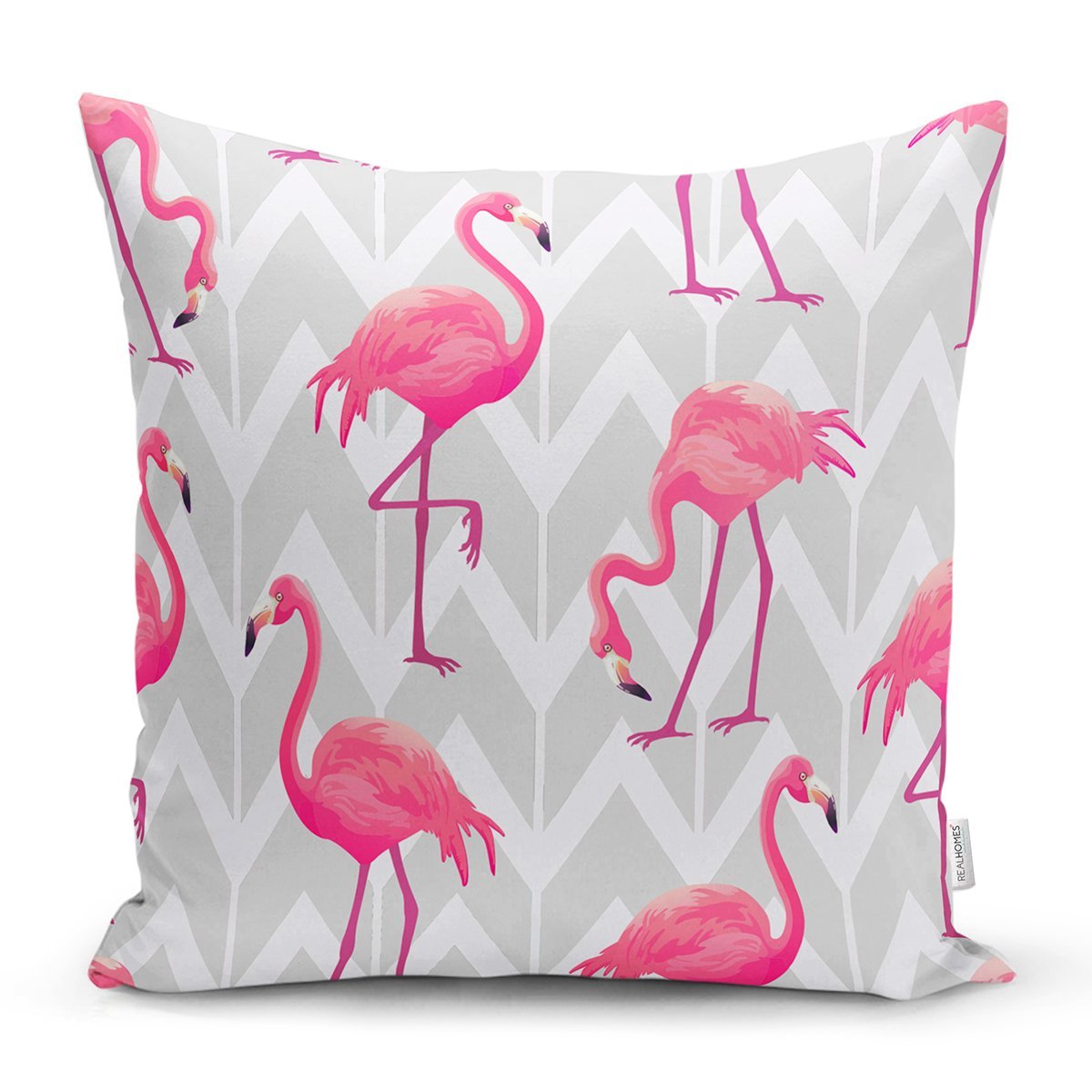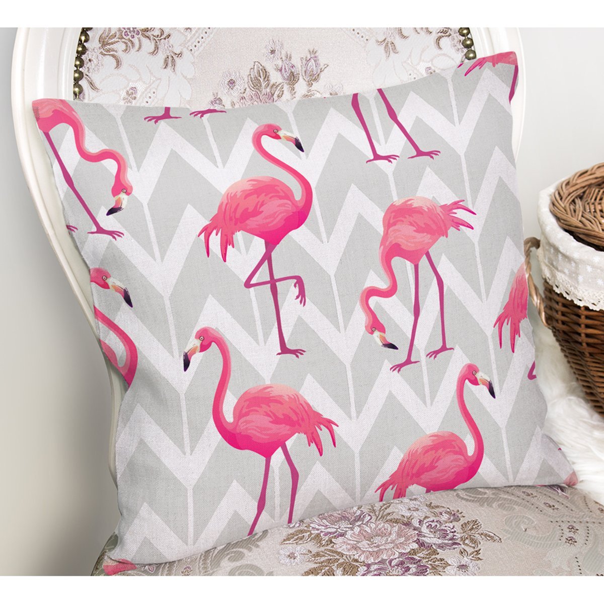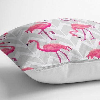 Gri Zikzak Zeminde Flamingolar Temalı Modern Yastık Kırlent Kılıfı