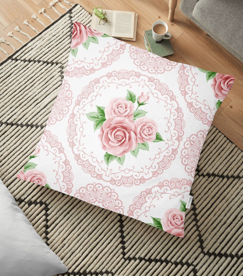 Hint Motifli Gül Desenli Dijital Baskılı Yer Minderi – 70 x 70 cm