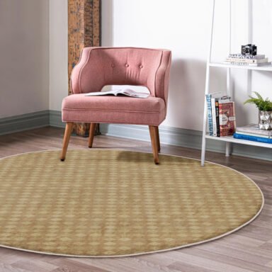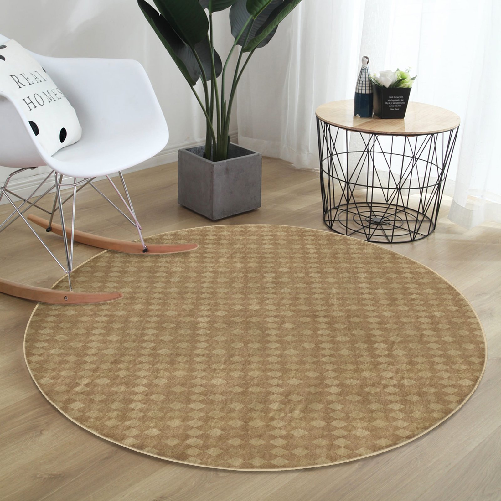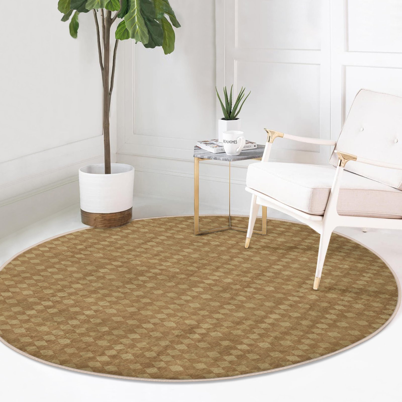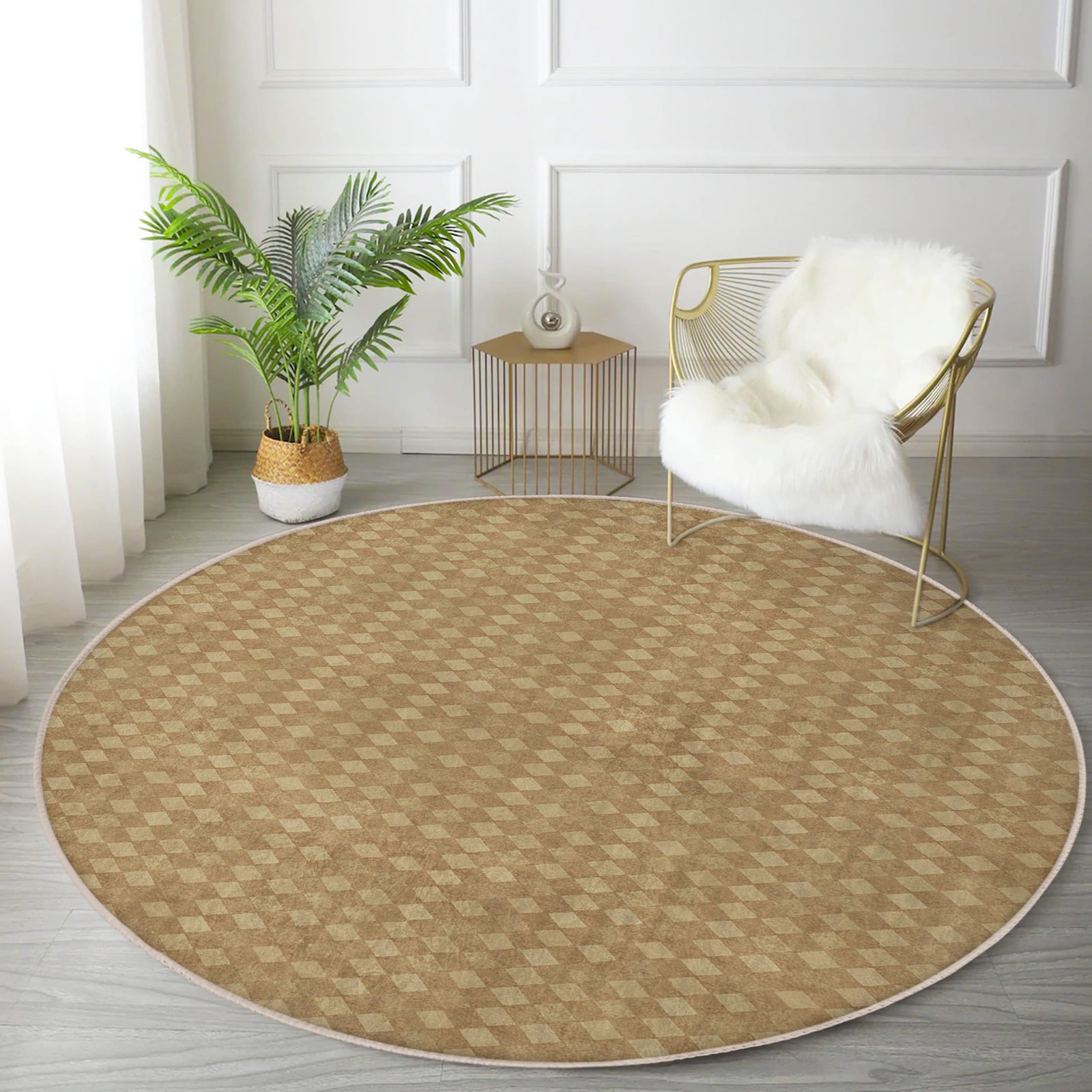 Kahverengi Geometrik Desenli Yuvarlak Salon Halısı – Yıkanabilir Kaymaz Tabanlı Modern Halı
