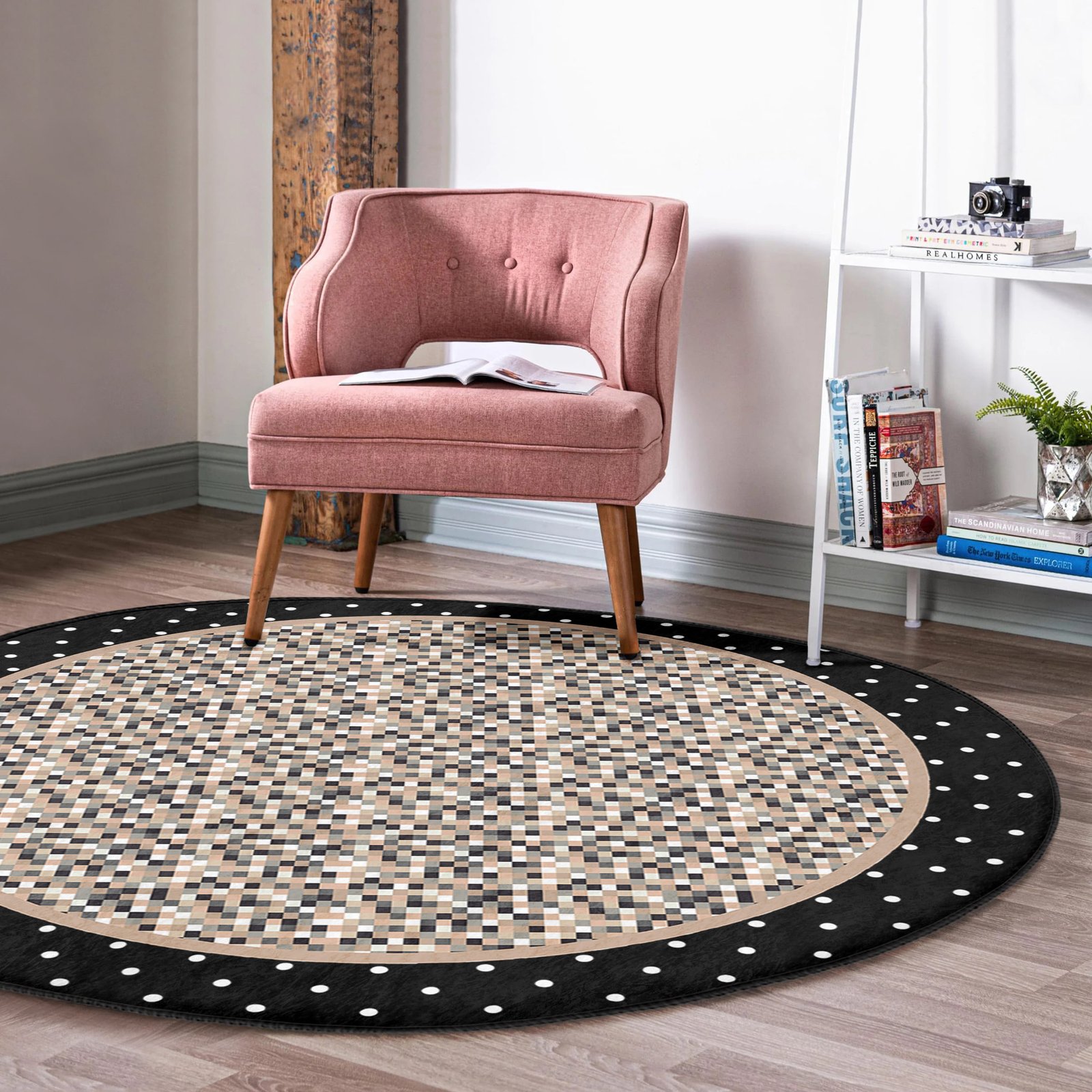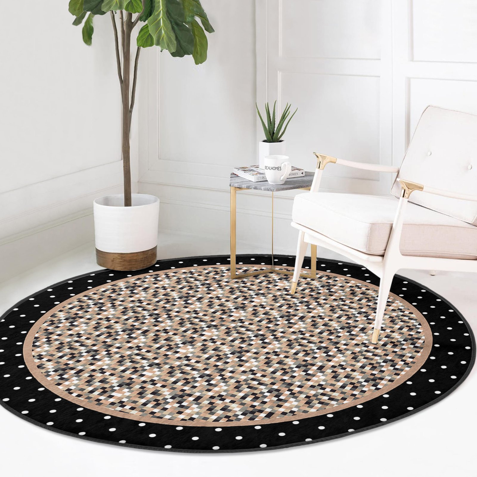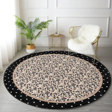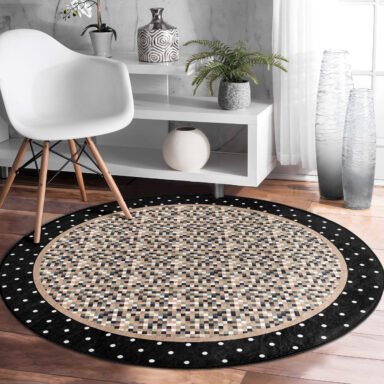 Kare Desenli Siyah Zemin Üzerinde Minimalist Geometrik Motifli Yuvarlak Salon Halısı – Yıkanabilir Kaymaz Tabanlı