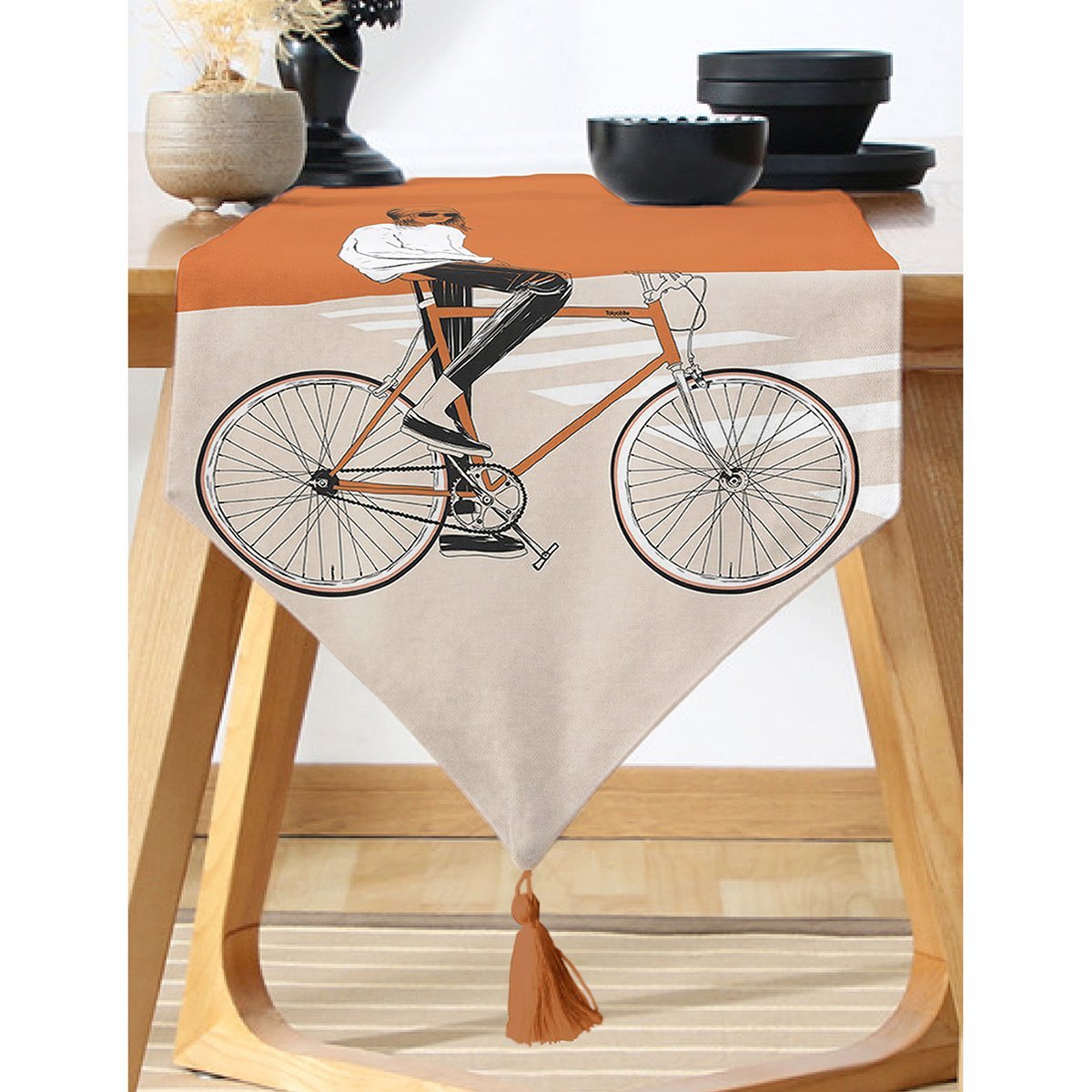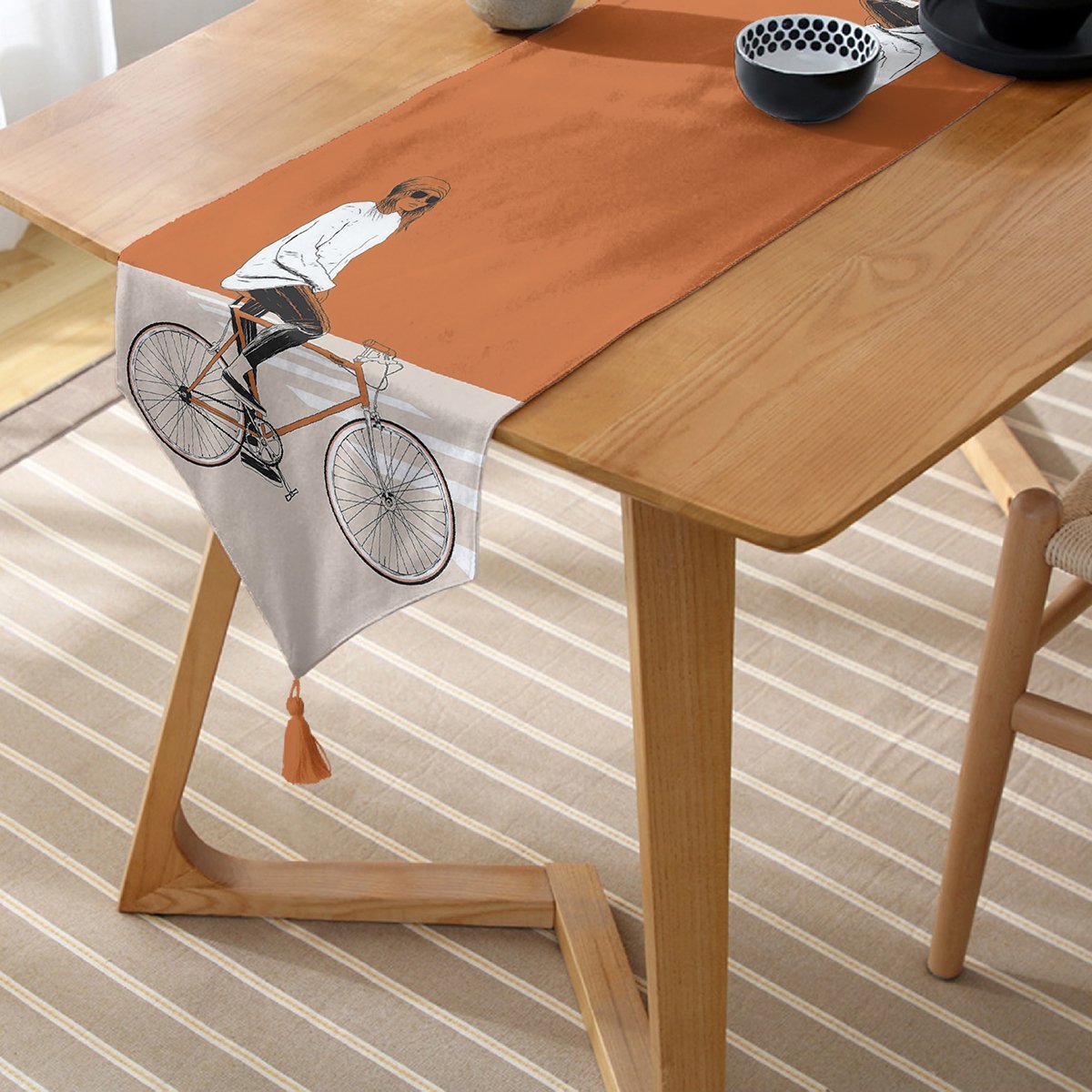 Koyu Turuncu Krem Zemin Bisikletli Adam Motifli Püsküllü Şönil Üçgen Runner