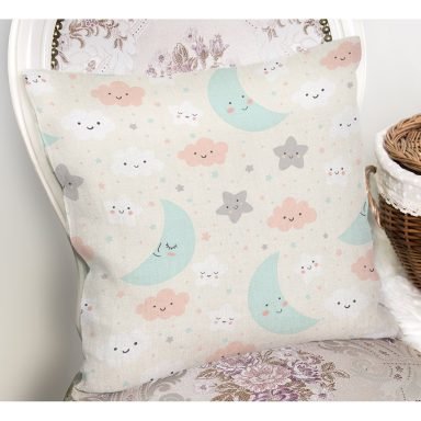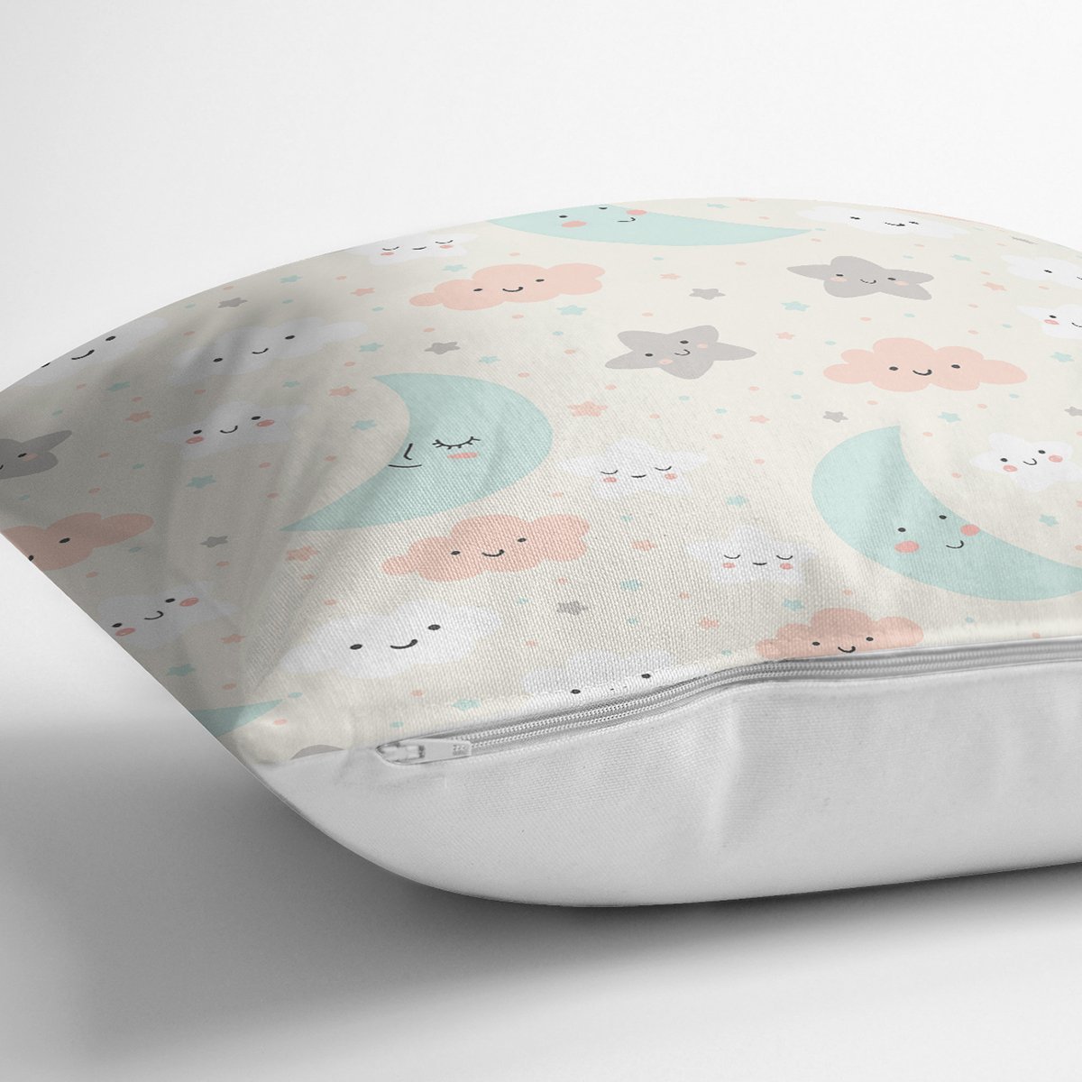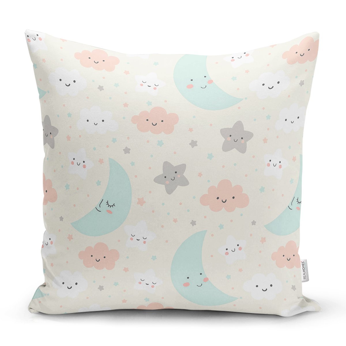 Krem Zeminde Bulut Ve Ay Desenli Dijital Baskılı Özel Tasarım Modern Yastık Kırlent Kılıfı