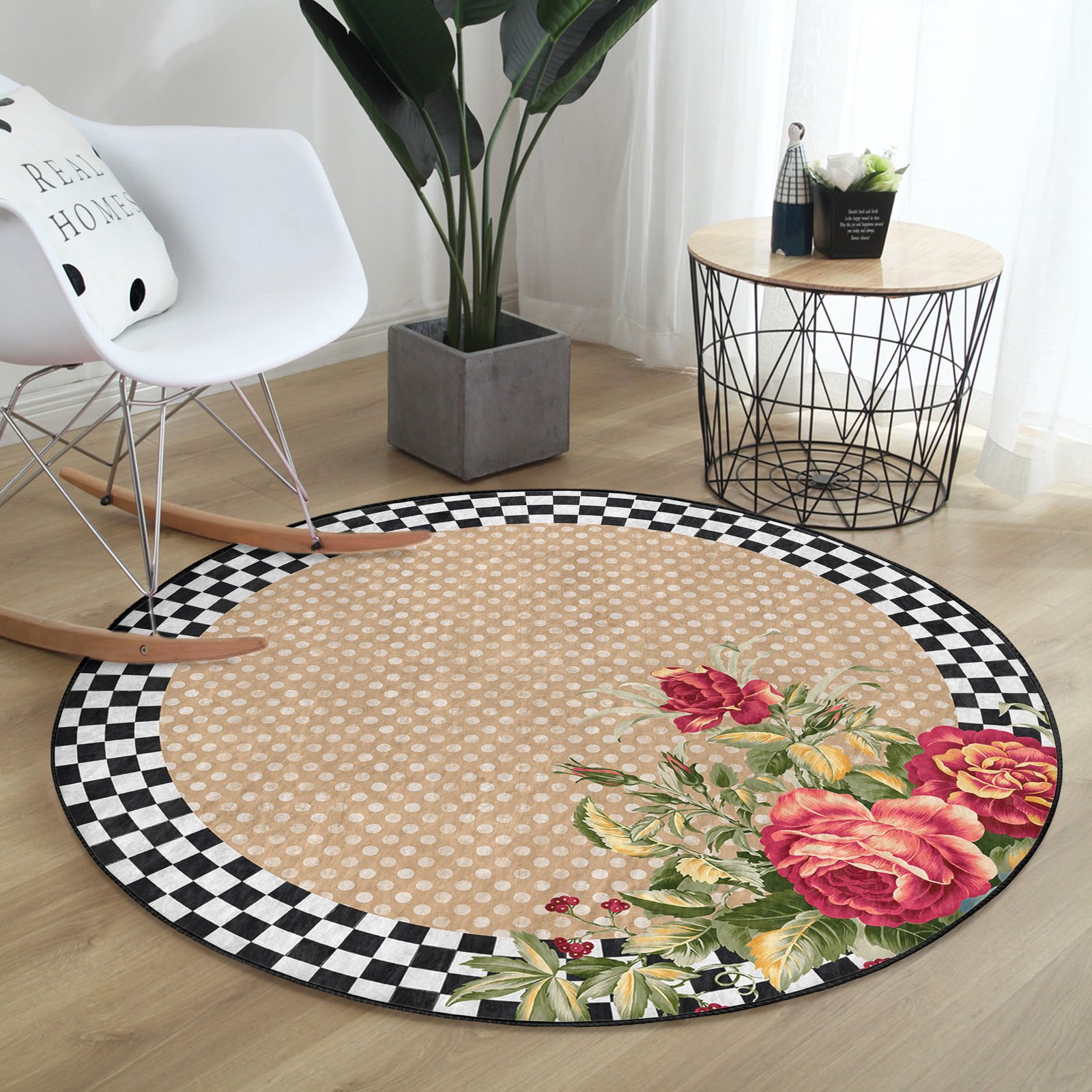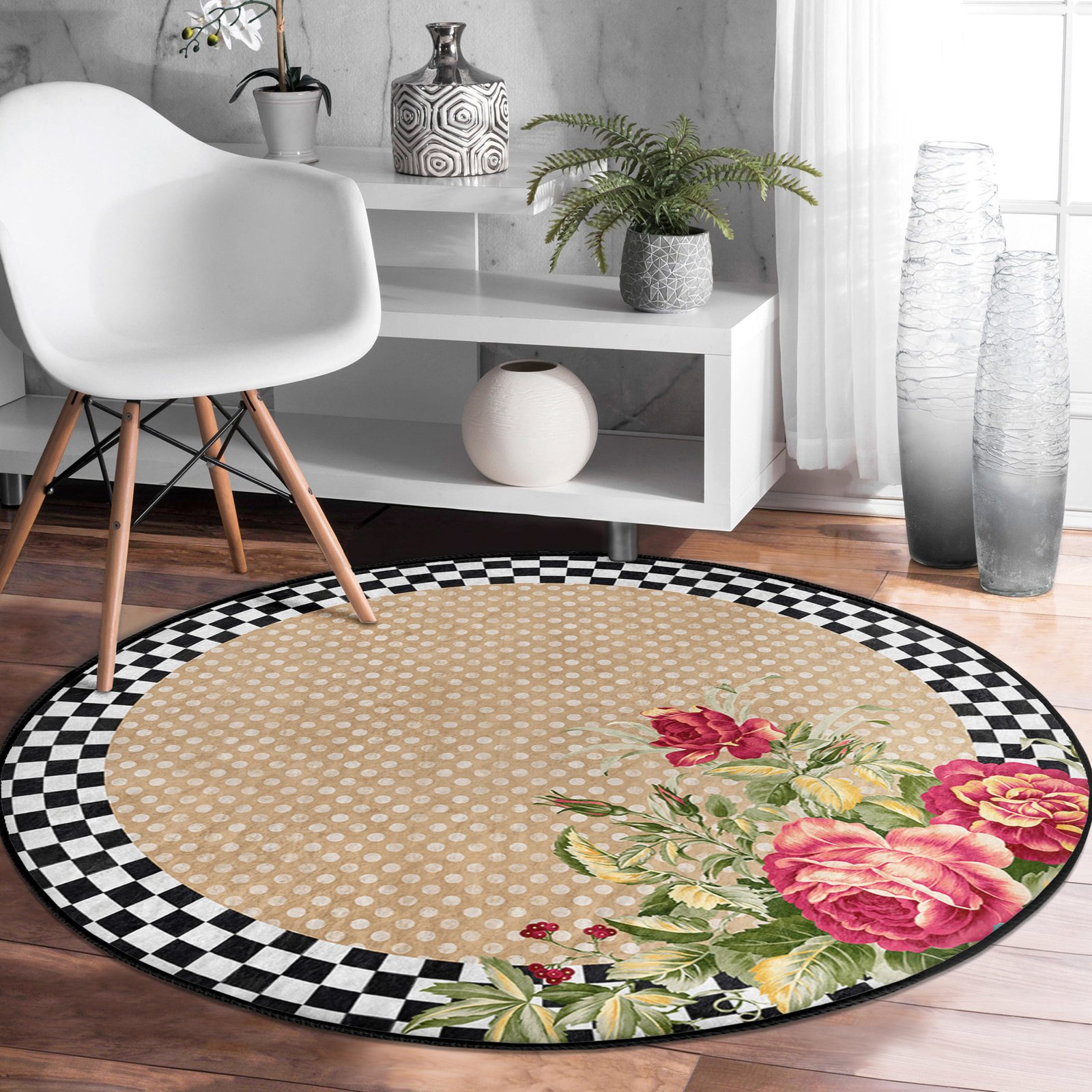 Krem Zeminde Çiçek Desenli Dört Mevsim Kullanımlık Yuvarlak Salon Halısı – Kaymaz Taban ile Şıklık