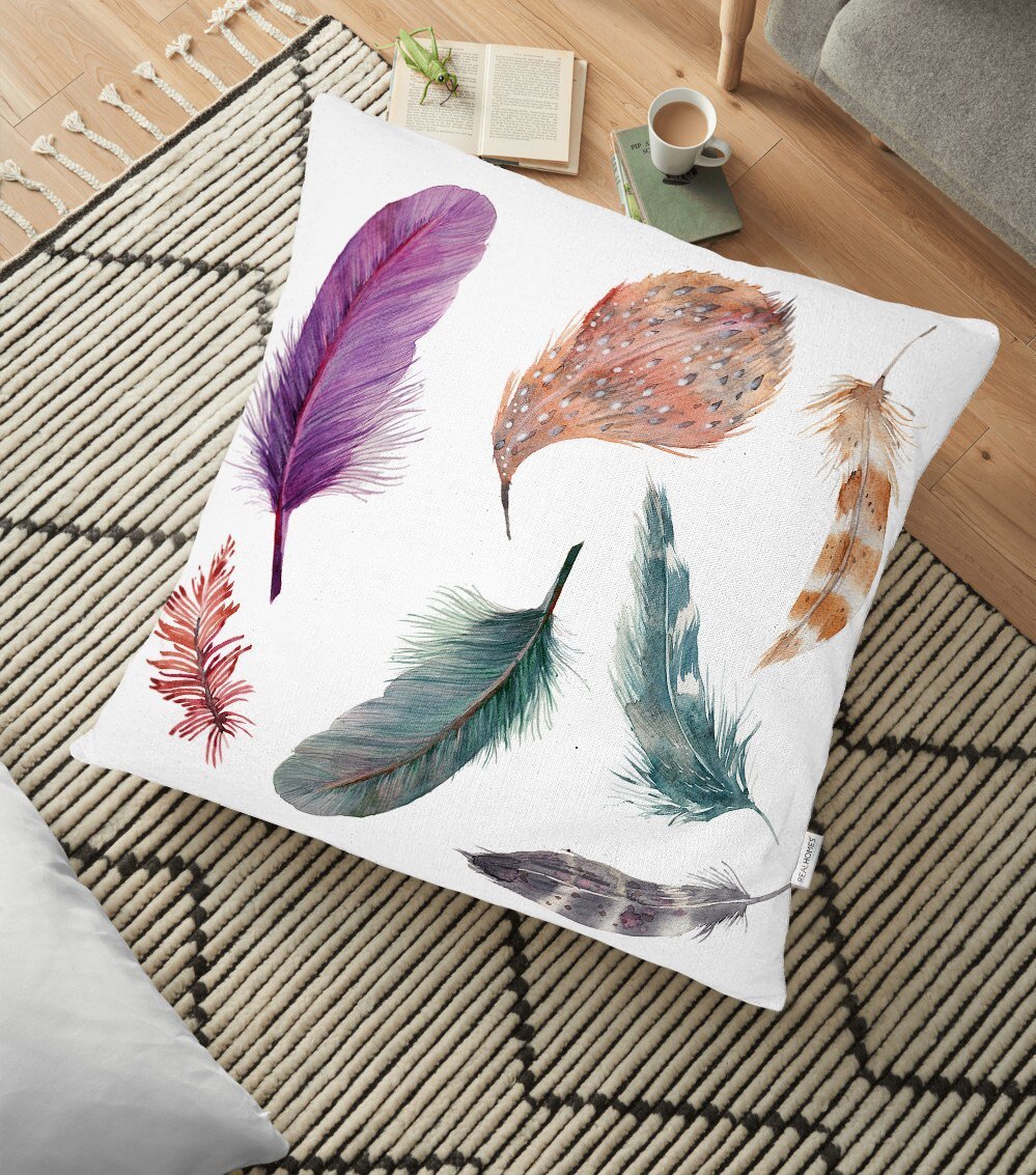 Kuş Tüyü Resimli Dijital Baskılı Dekoratif Yer Minderi – 70 x 70 cm