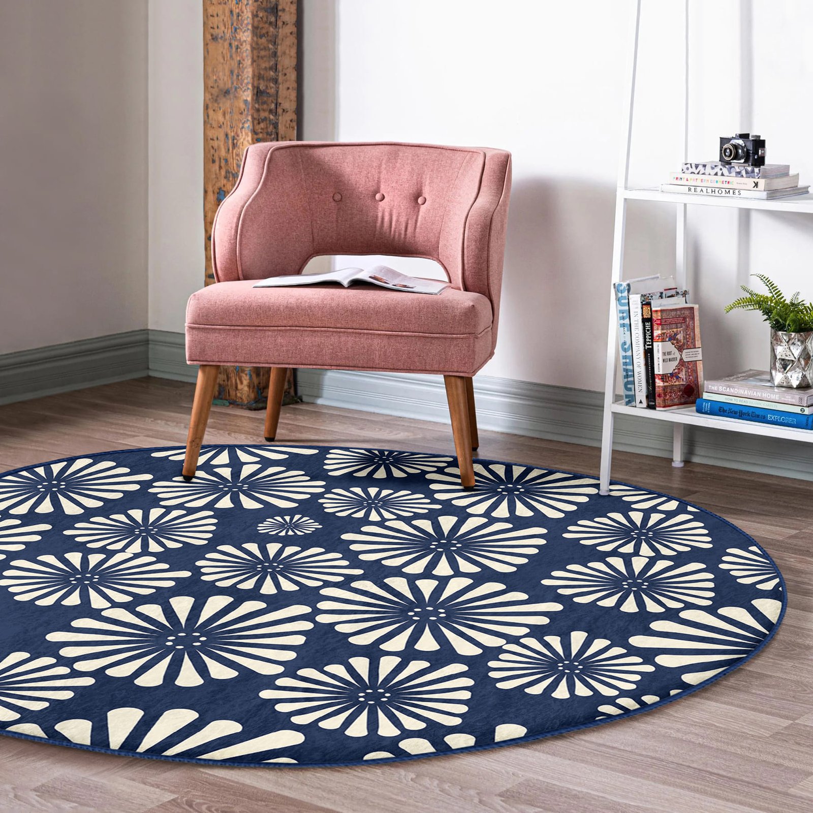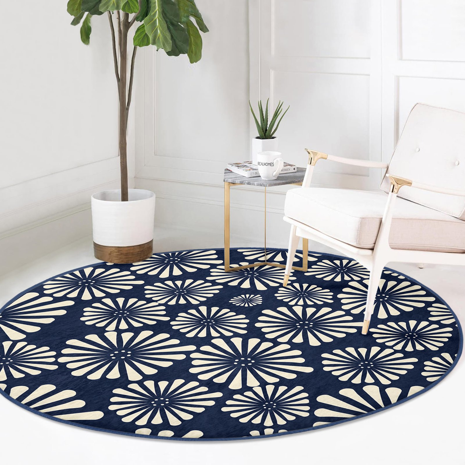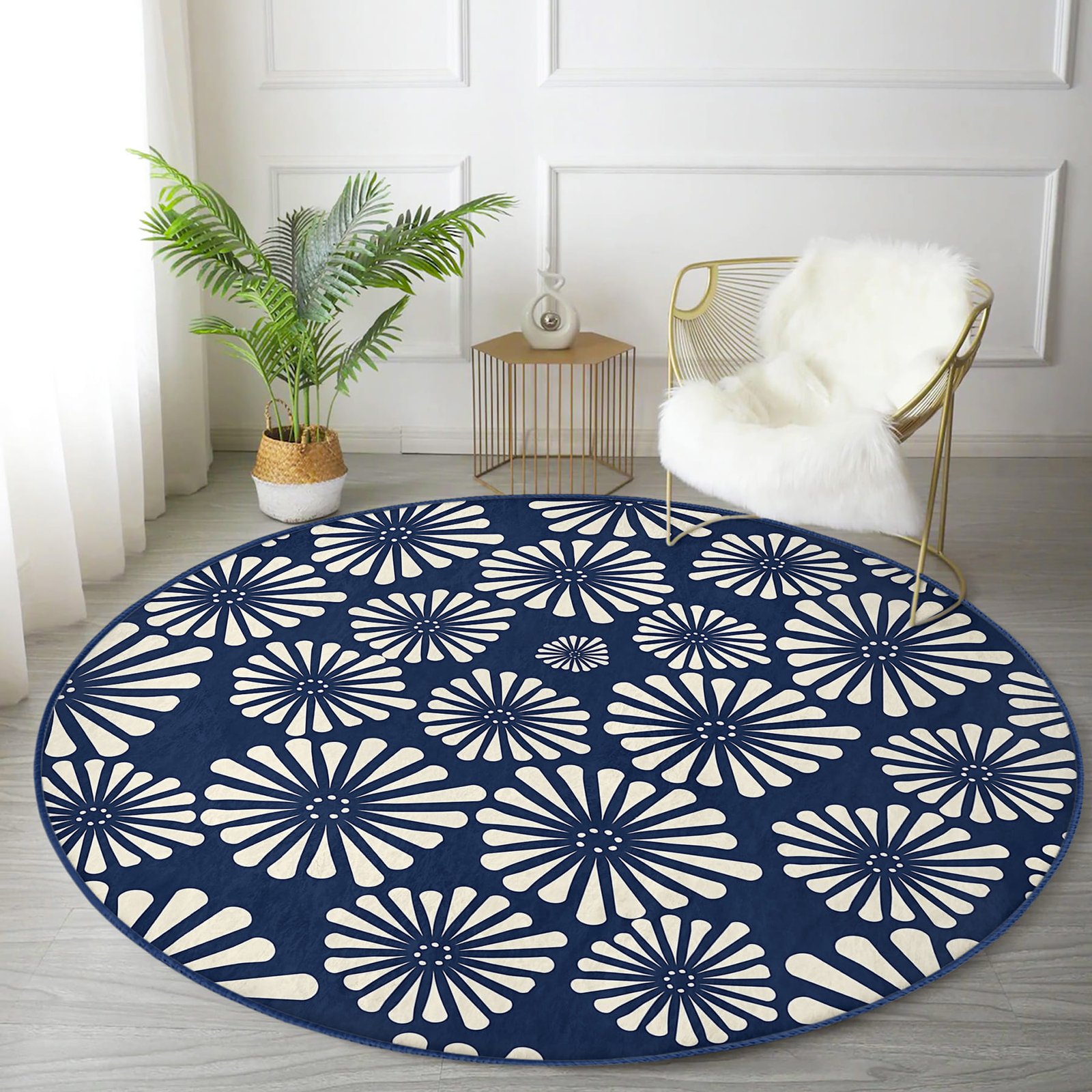Lacivert Zeminde Onedraw Çizimli Papatya Modern Salon Ve Oturma Odası Kaymaz Tabanlı Yuvarlak Halı