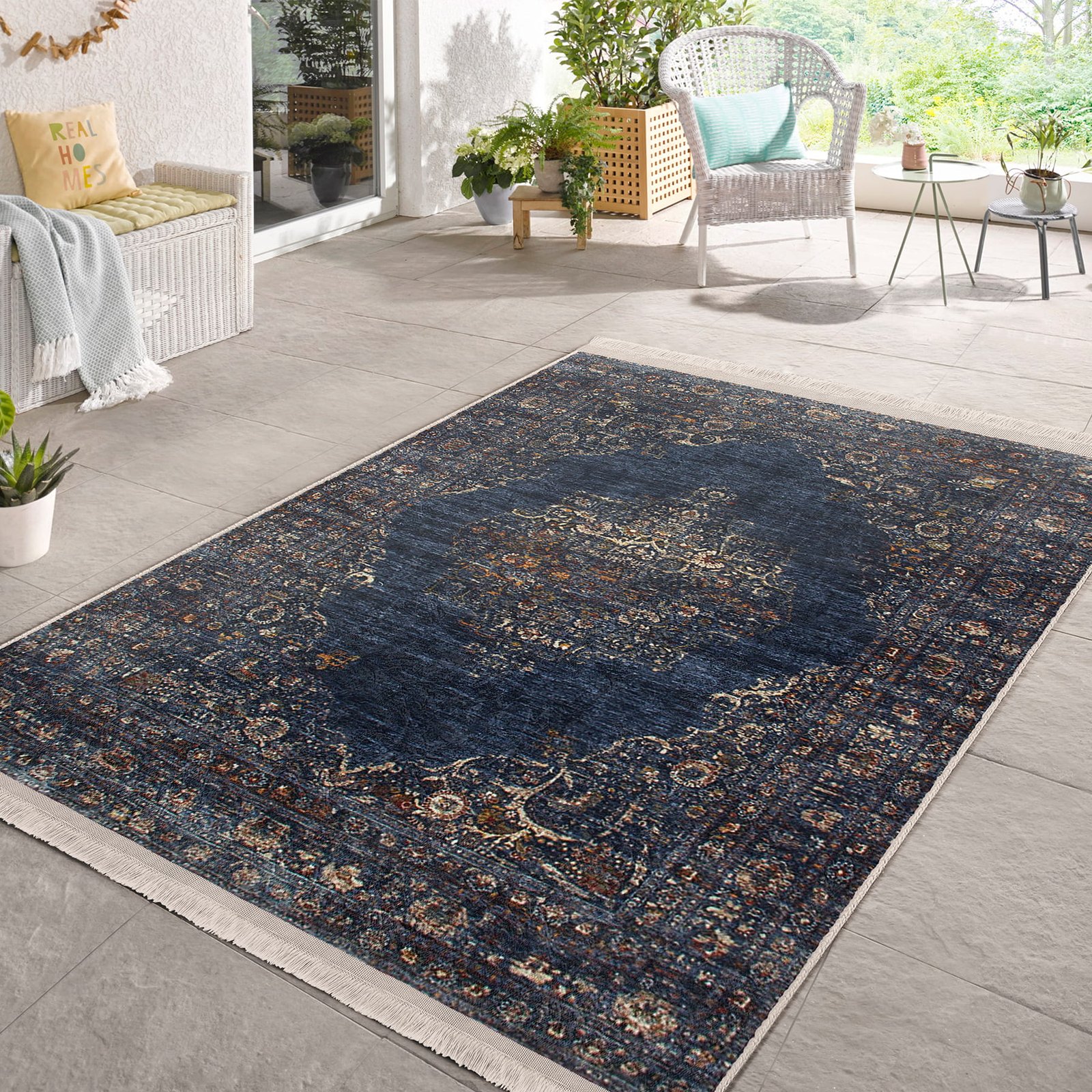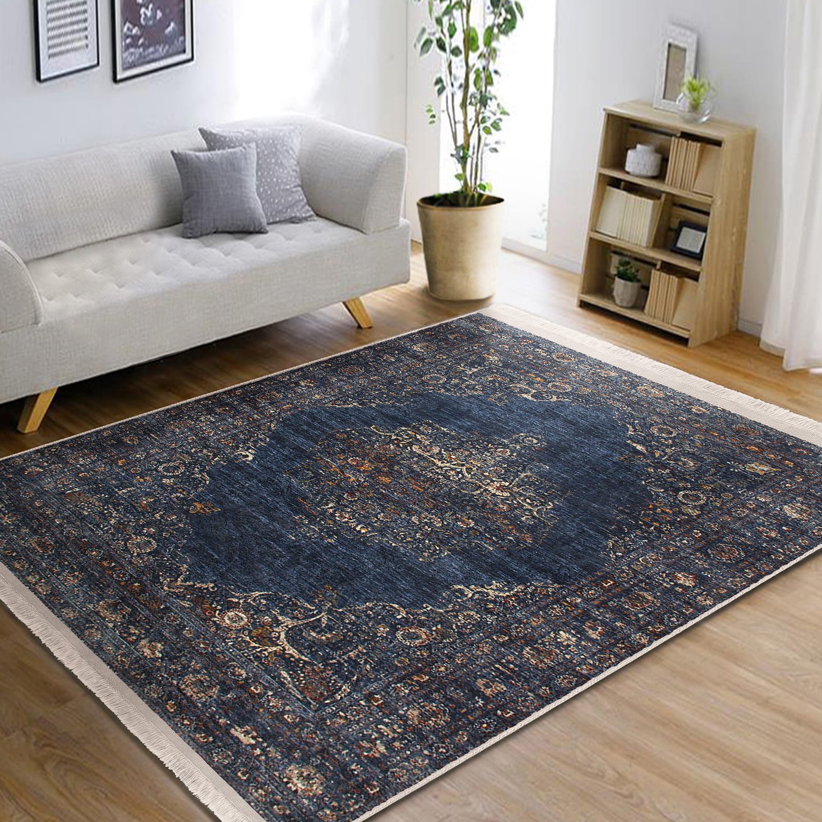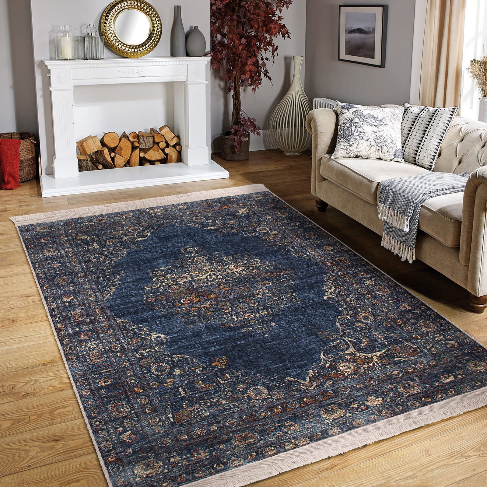 Lacivert Zeminde Osmanlı Motifli Altın Detay Desenli Avangarde Eskitme Motifli Salon & Oturma Odası Yatak Odası Dijital Baskılı Makinede Yıkanabilir Kaymaz Taban Saçaklı Halı