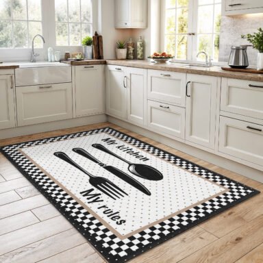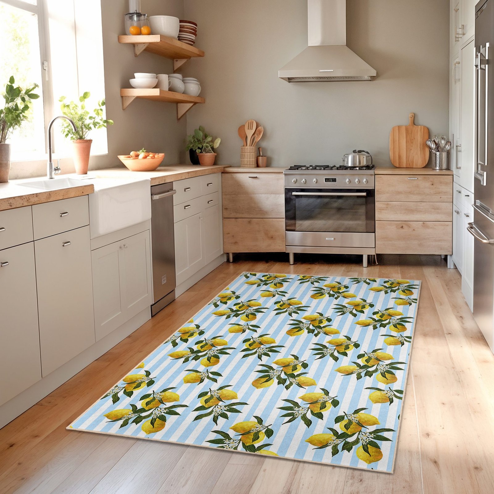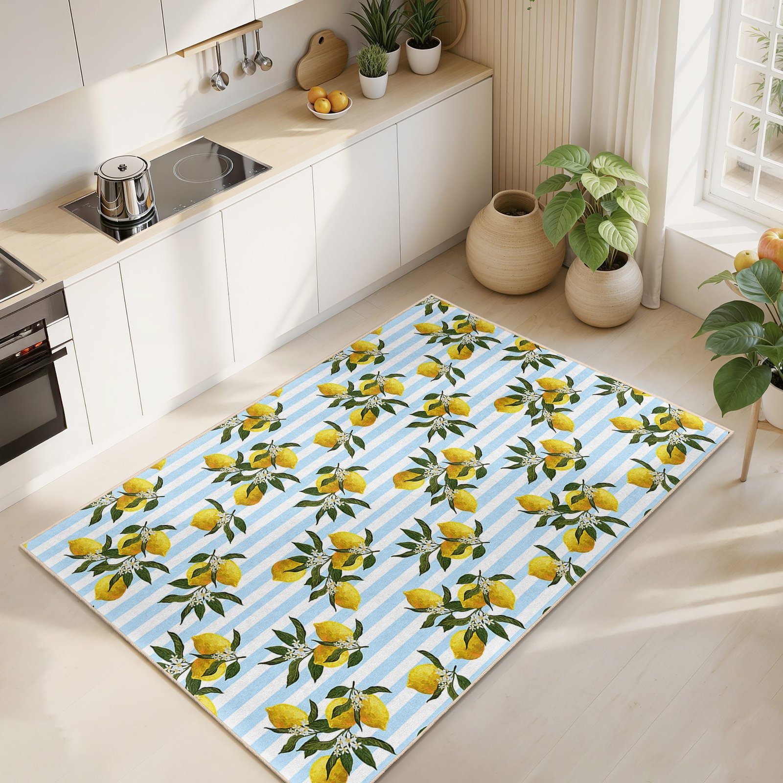 Mavi beyaz çizgili zemin üzerine serpiştirilmiş canlı sarı limonlar ve yeşil yapraklardan oluşan bu limon desenli mutfak halısı, Akdeniz esintili enerjik atmosferiyle mutfağa taze ve aydınlık bir görünüm kazandırır; dijital baskı netliğiyle renkleri belirginleştirir, yıkanabilir yapısı günlük kullanımı kolaylaştırır ve kaymaz tabanı sayesinde yemek hazırlarken güvenli, dengeli ve konforlu bir zemin hissi sunar.