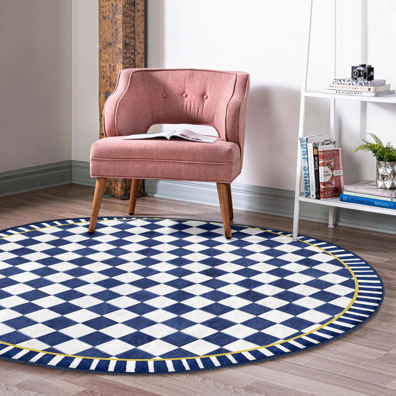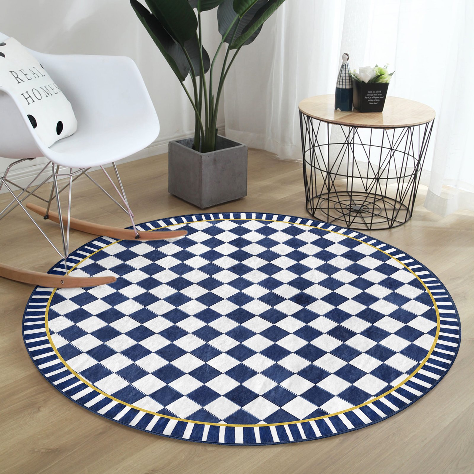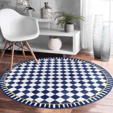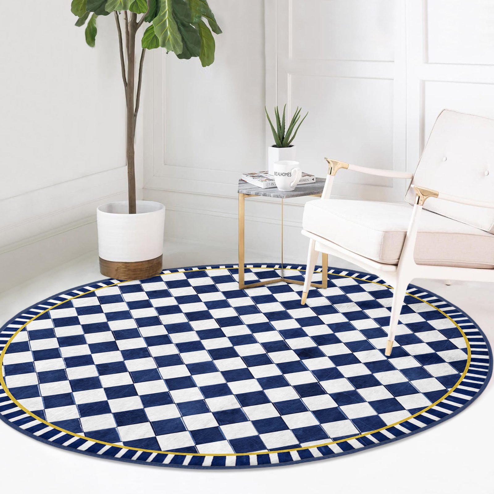 Mavi & Beyaz Kareli Desenli Yuvarlak Salon Halısı – Şık ve Modern Tasarımla Yıkanabilir Kaymaz Taban Halı
