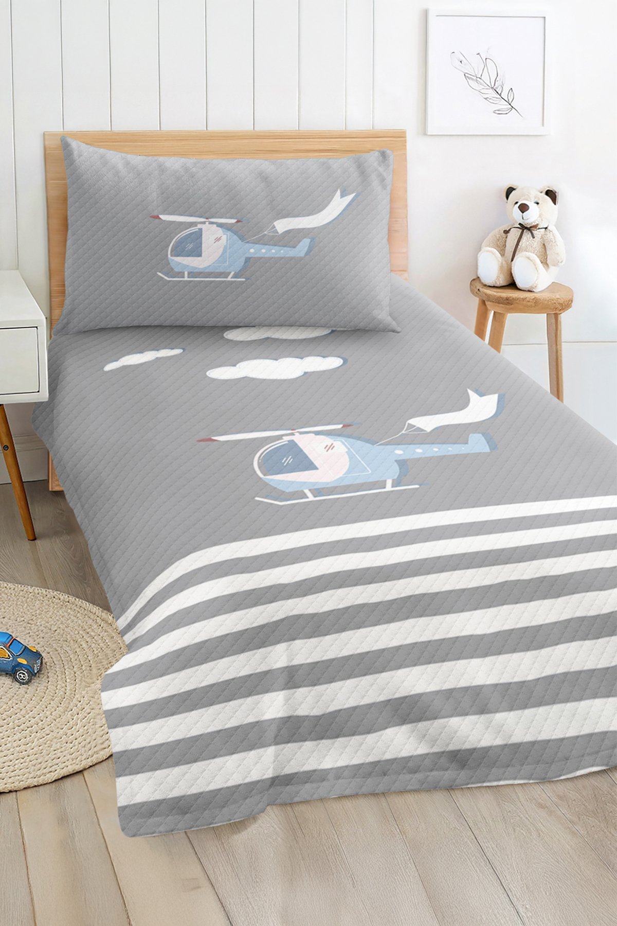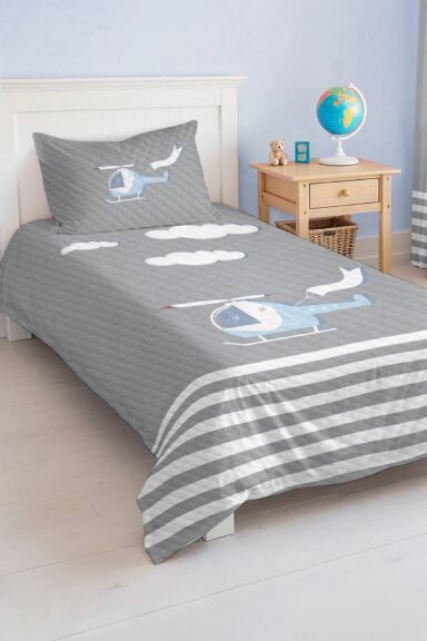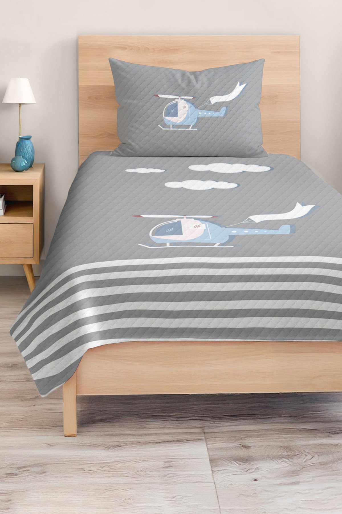 Mavi Helikopter Desenli Modern Gri Renkli Çocuk ve Genç Odası Tek Kişilik Pike Takımı
