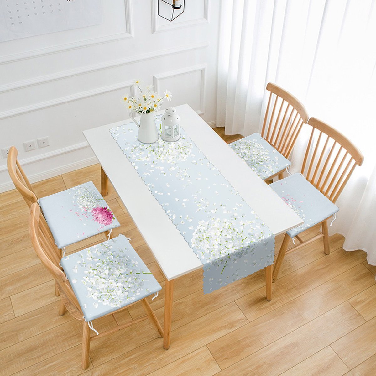 Mavi Zeminde Ortanca Çiçeği Tasarımlı 4 Fermuarlı Sandalye Minderi ve 1 Runner Seti