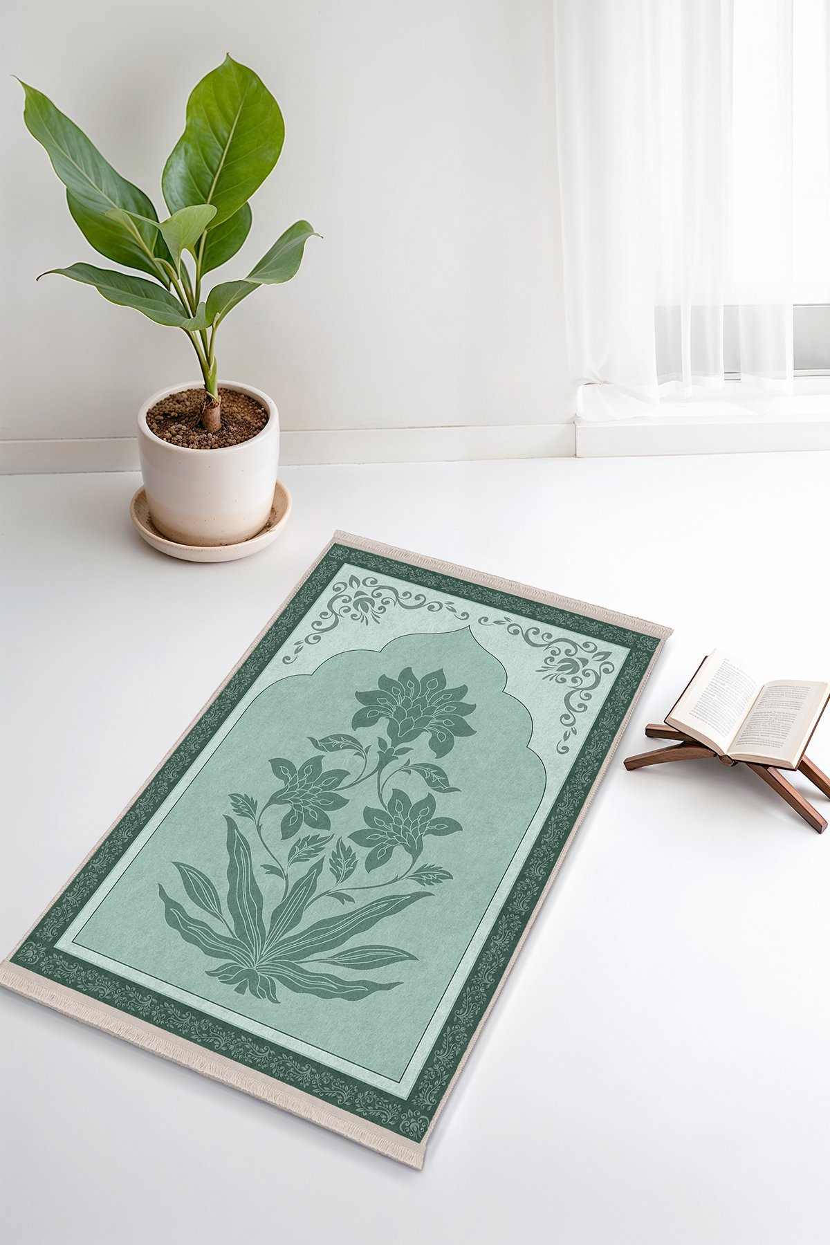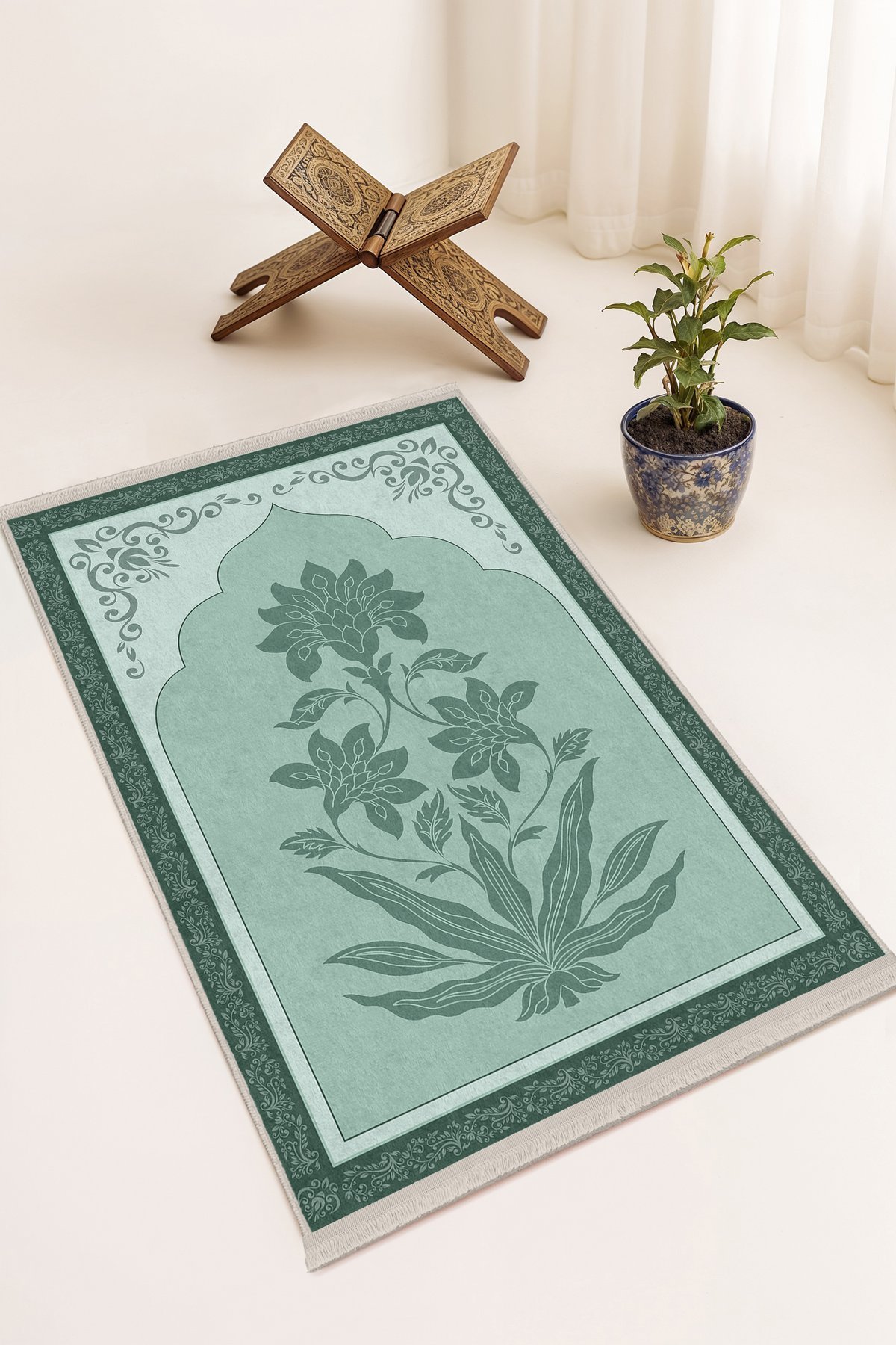 Mint Yeşili Çiçekli Dijital Baskılı Kaymaz Tabanlı Saçaklı Namazlık Seccade