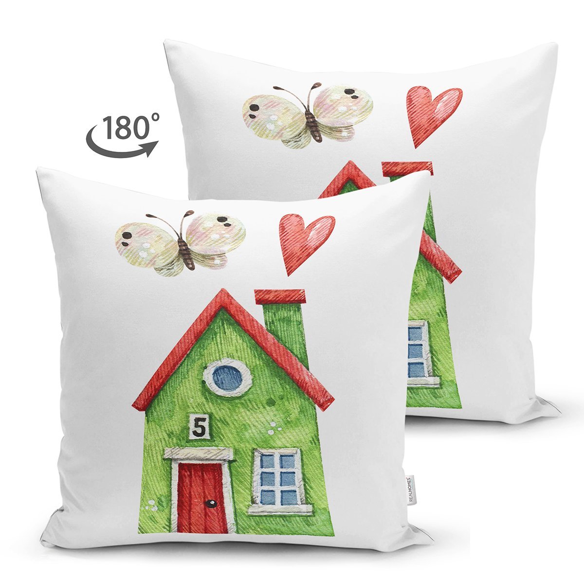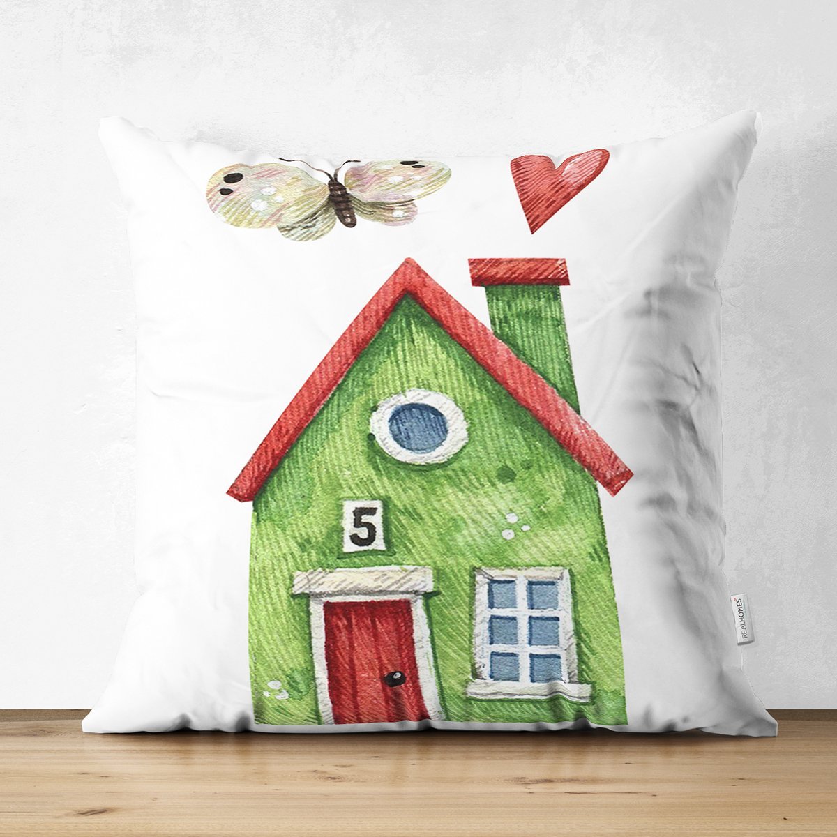 Minyatür Yeşil Ev Çizimli Dijital Baskılı Modern Süet Yastık Kırlent Kılıfı