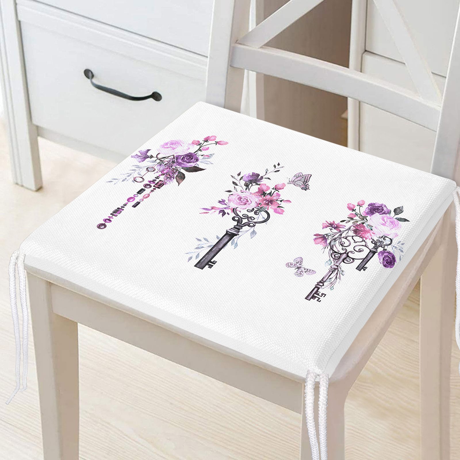 Mor Renk Anahtar Motifli Çiçek Desenli Çizgili Fermuarlı Sandalye Minderi