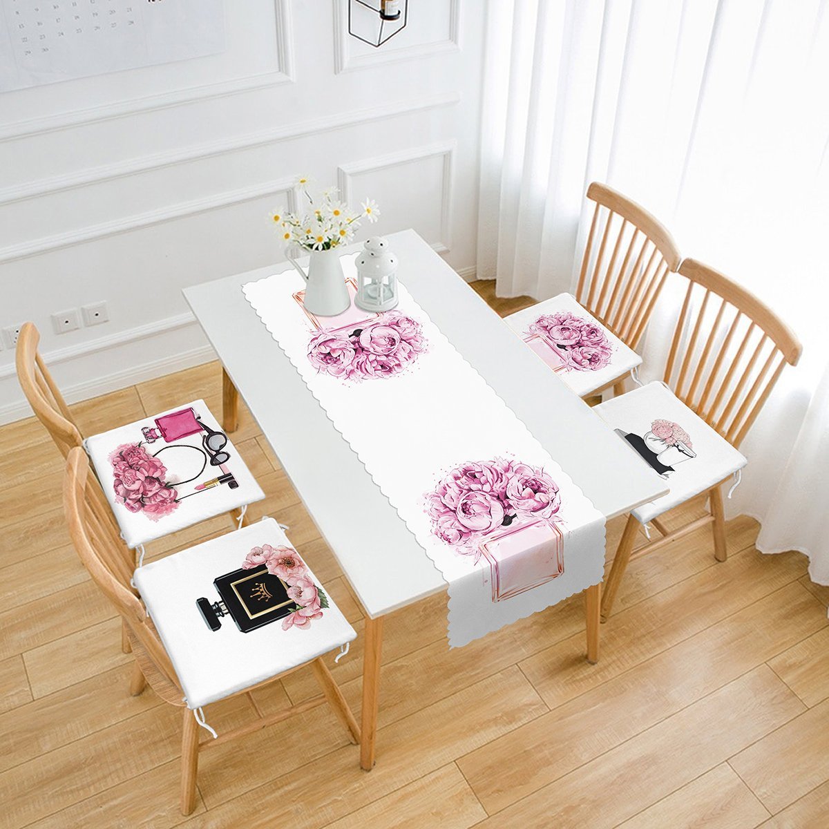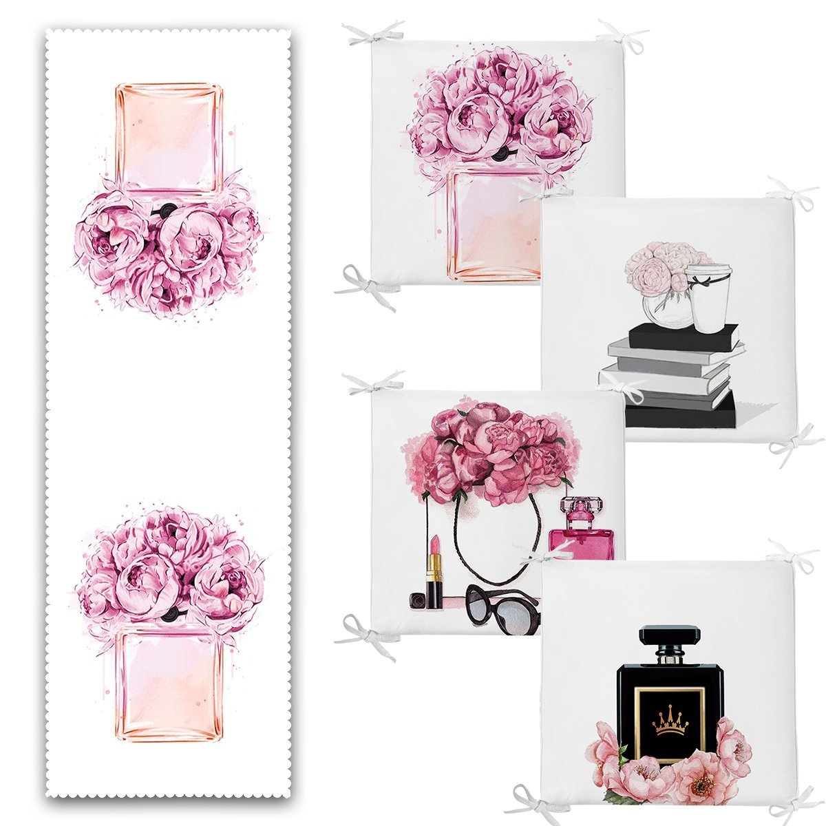 Parfüm Şişesi Tasarımlı 4 Fermuarlı Sandalye Minderi ve 1 Runner Seti