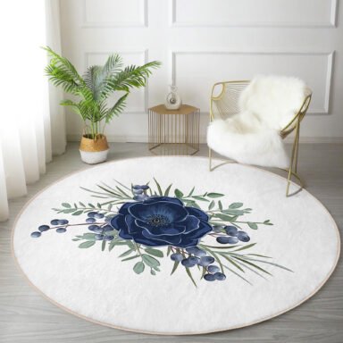 Pastel Mavi Gül Desenli Dijital Baskılı Lacivert Mutfak Yıkanabilir Kaymaz Tabanlı Yuvarlak Halı