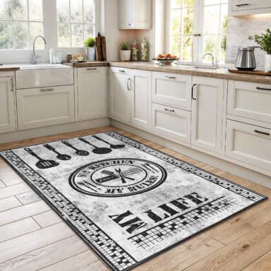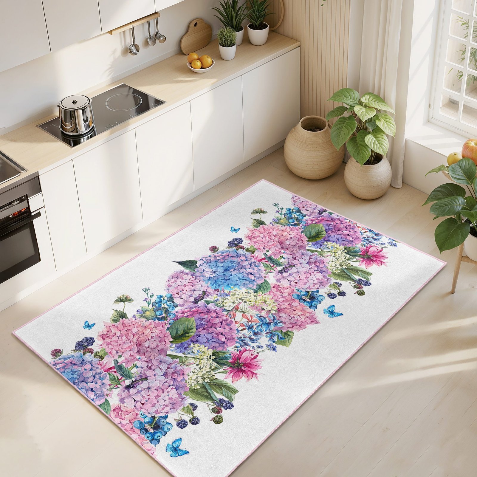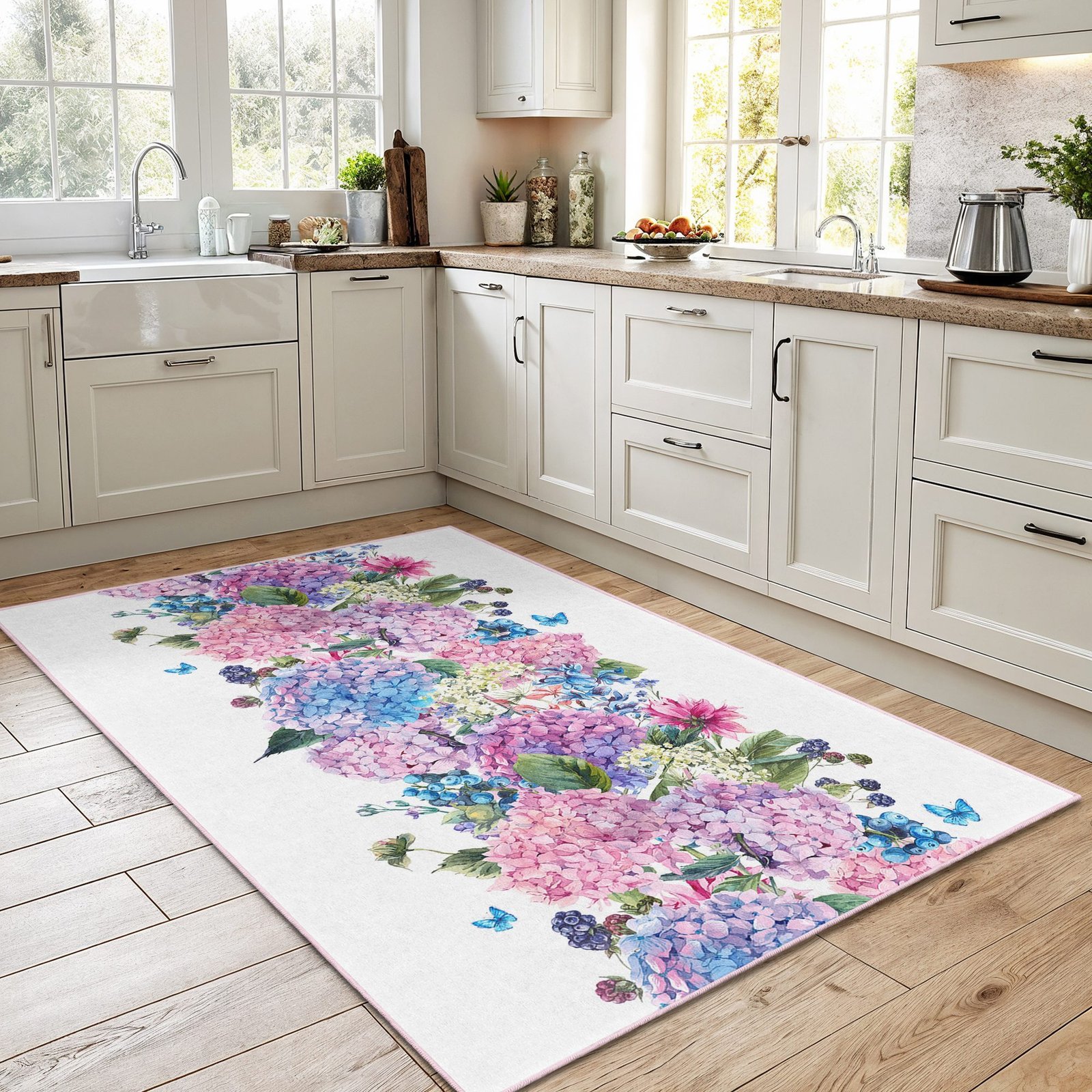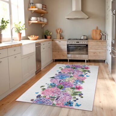 Beyaz zemin üzerinde pembe mor ve mavi tonlarda ortanca çiçekleri, yeşil yapraklar ve zarif kelebeklerle canlanan bu desenli mutfak halısı, pastel renk paletiyle mutfağa ferah, romantik ve aydınlık bir atmosfer katar; dijital baskı kalitesi sayesinde desenler canlı görünür, yıkanabilir yapısı günlük kullanımı kolaylaştırır ve kaymaz tabanı tezgâh önünde güvenli, konforlu bir adım hissi sunarak mutfakta sıcak ve düzenli bir görünüm oluşturur.
