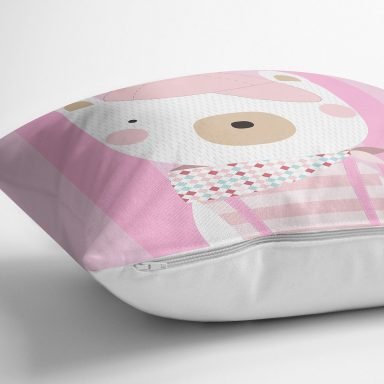 Pembe Çizgili Zemin Şapkalı Ayıcık Desenli Dijital Baskılı Modern Yastık Kırlent Kılıfı