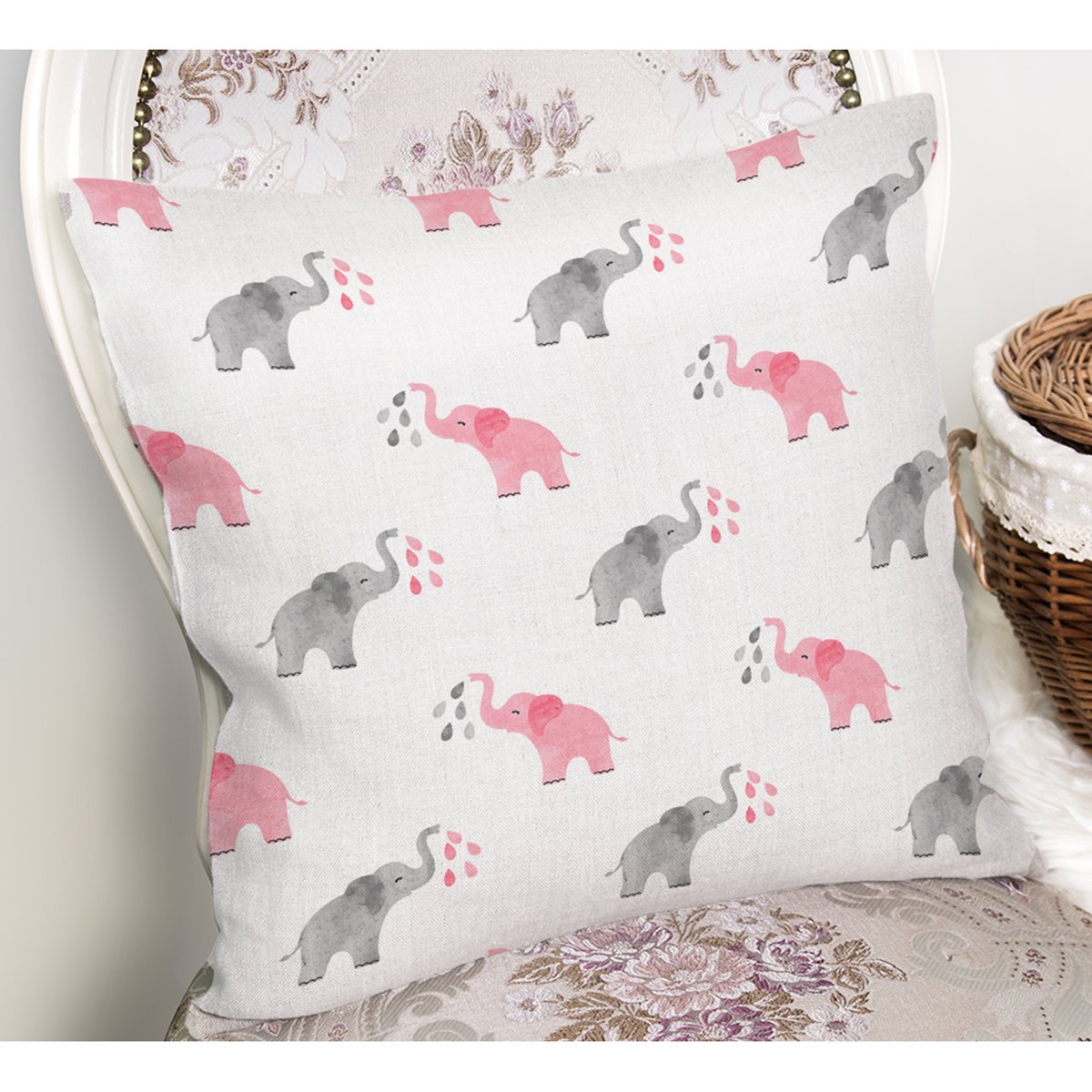 Pembe Gri Fil Desenli Dijital Baskılı Özel Tasarım Modern Yastık Kırlent Kılıfı