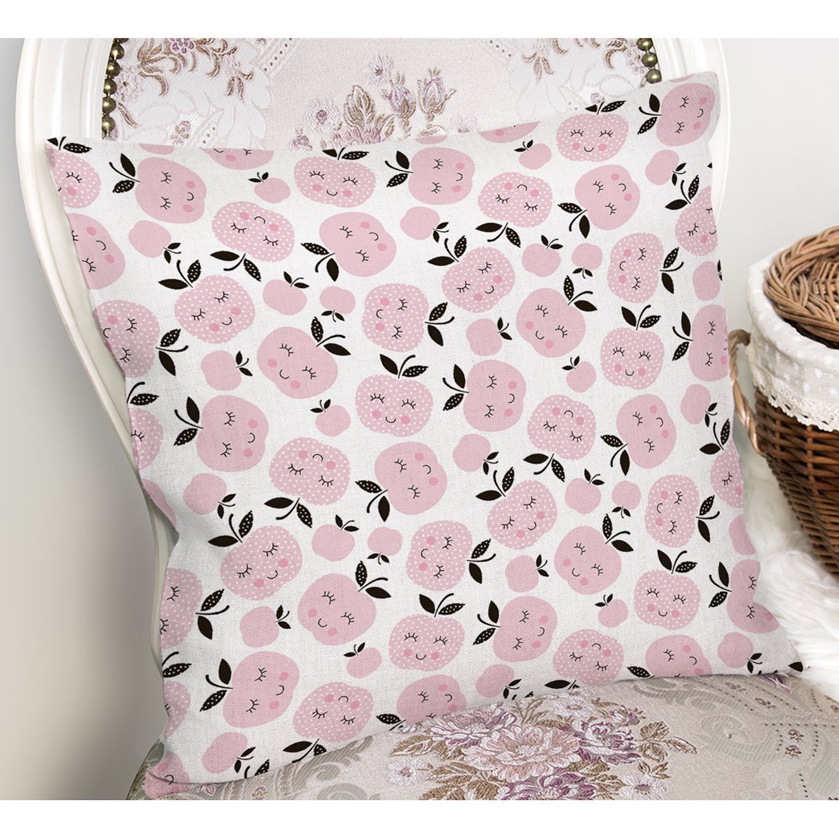 Pembe Gülümseyen Elmalar Motifli Dijital Baskılı Özel Tasarım Modern Yastık Kırlent Kılıfı