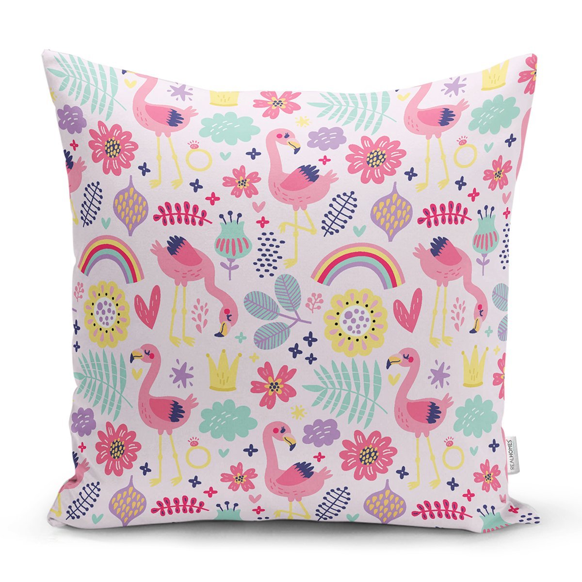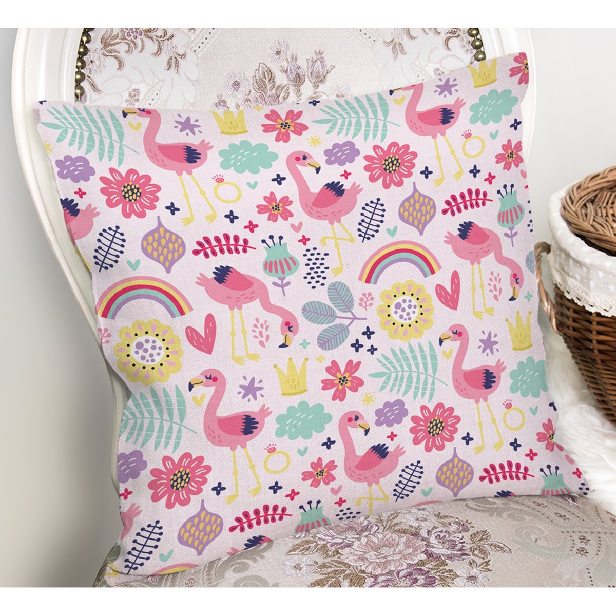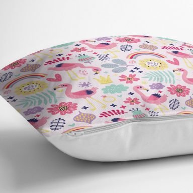 Pembe Pelikan Ve Çiçek Desenli Dijital Baskılı Özel Tasarım Modern Yastık Kırlent Kılıfı