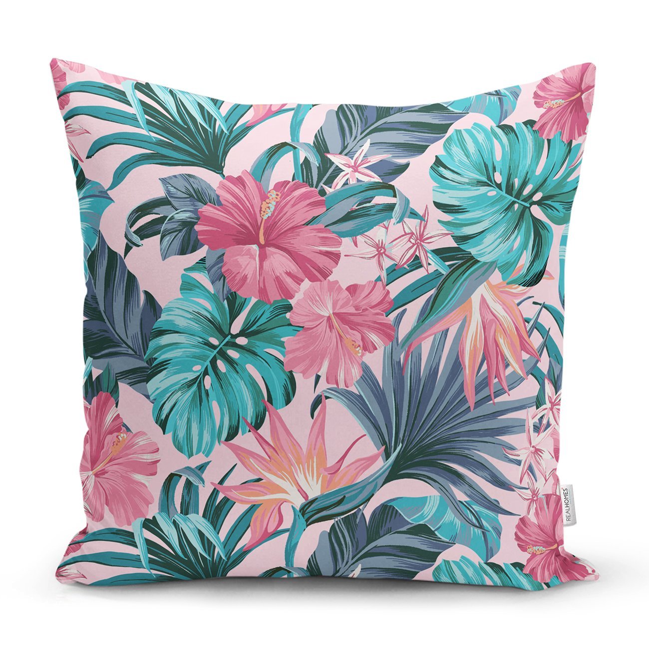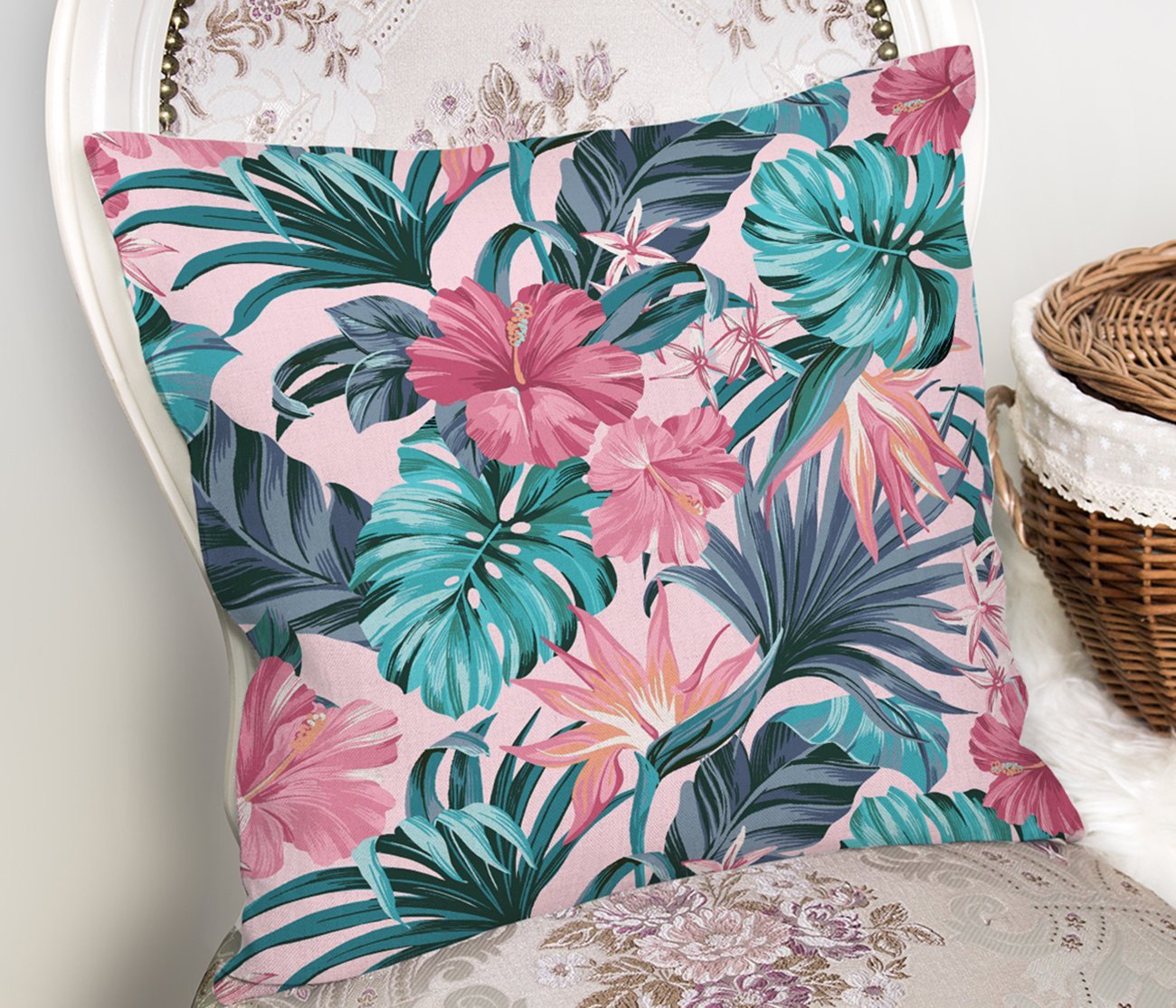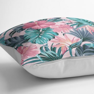 Pembe Zeminde Canlı Tropik Yaprakları Dijital Baskılı Kırlent Kılıfı