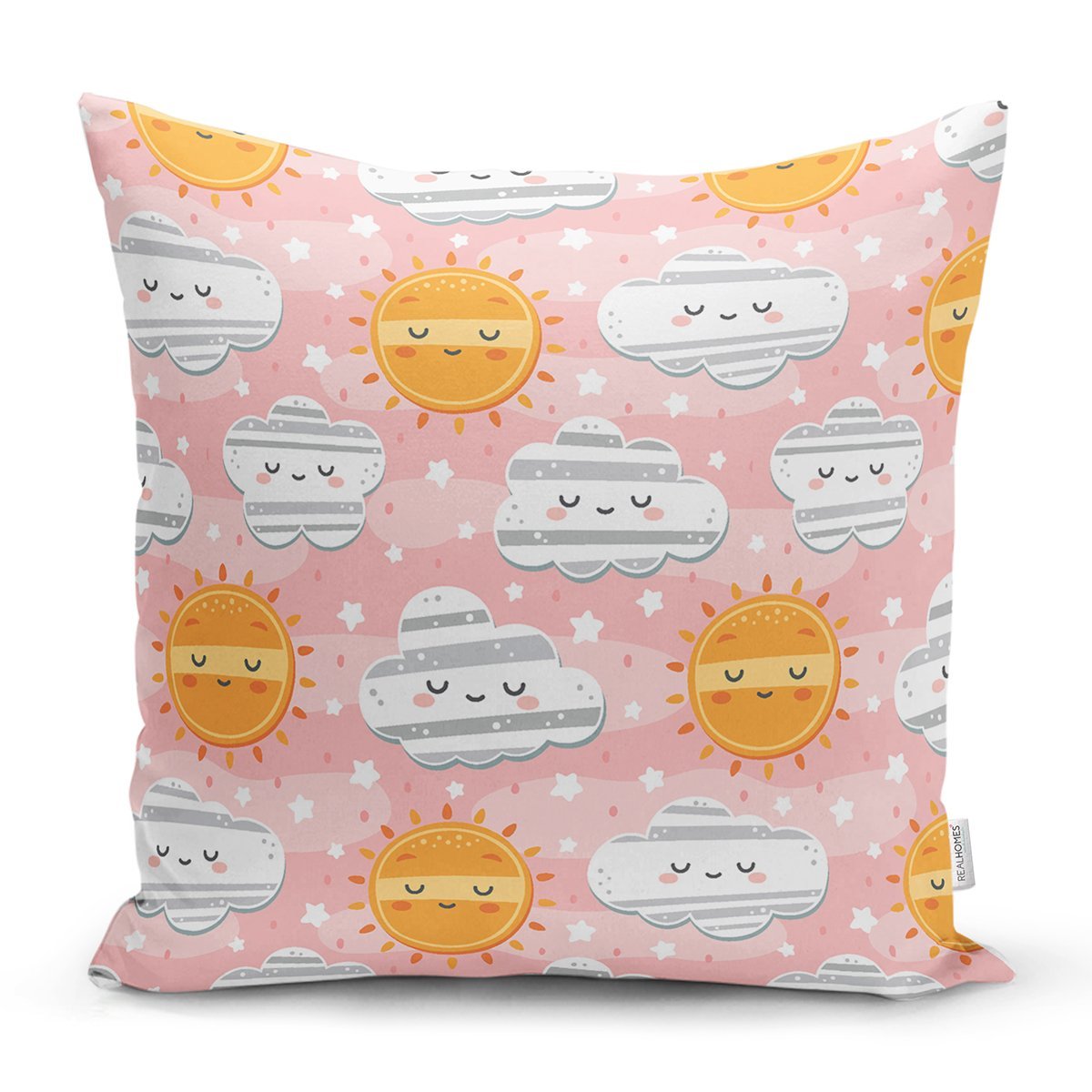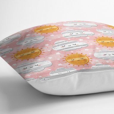 Pembe Zeminde Güneş Ve Bulut Motifli Dijital Baskılı Özel Tasarım Modern Yastık Kırlent Kılıfı