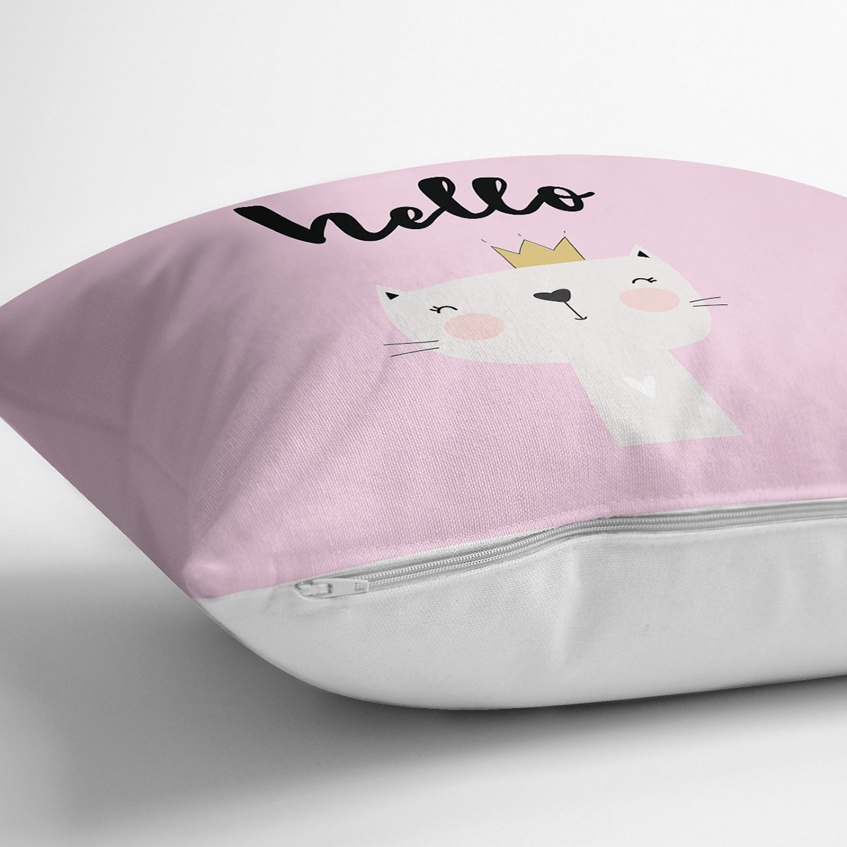 Pembe Zeminde Hello Kedicik Özel Tasarımlı Modern Yastık Kırlent Kılıfı