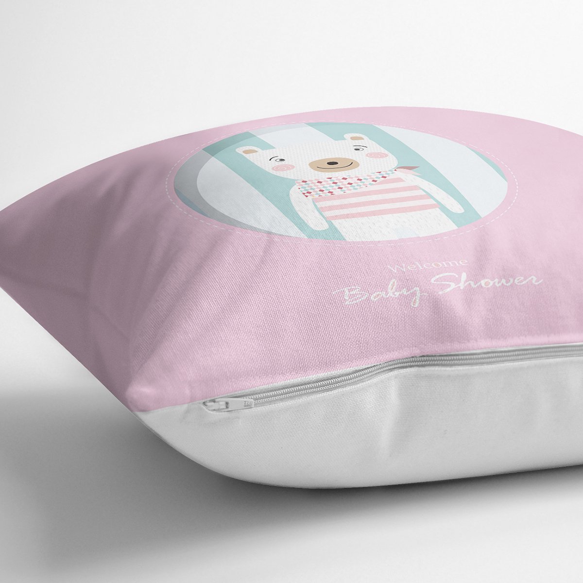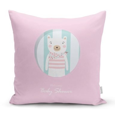 Pembe Zeminde Welcome Baby Shower Temalı Sevimli Ayıcık Modern Yastık Kırlent Kılıfı